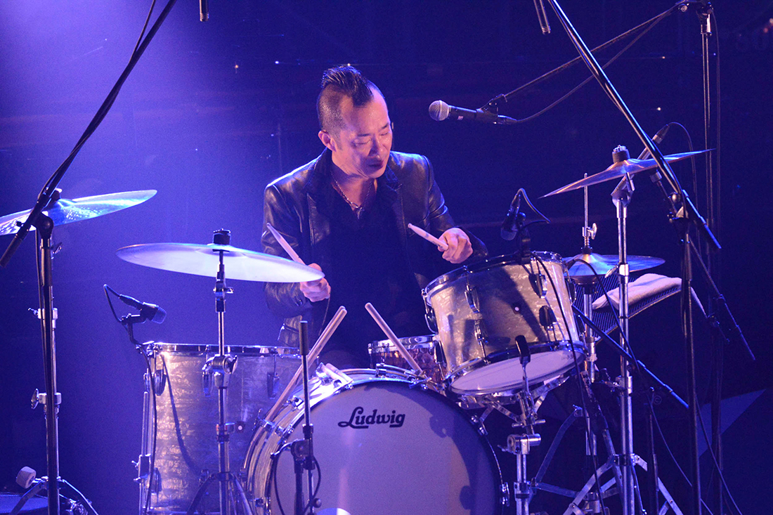 ドラムを叩いてるクハラカズユキさんと、