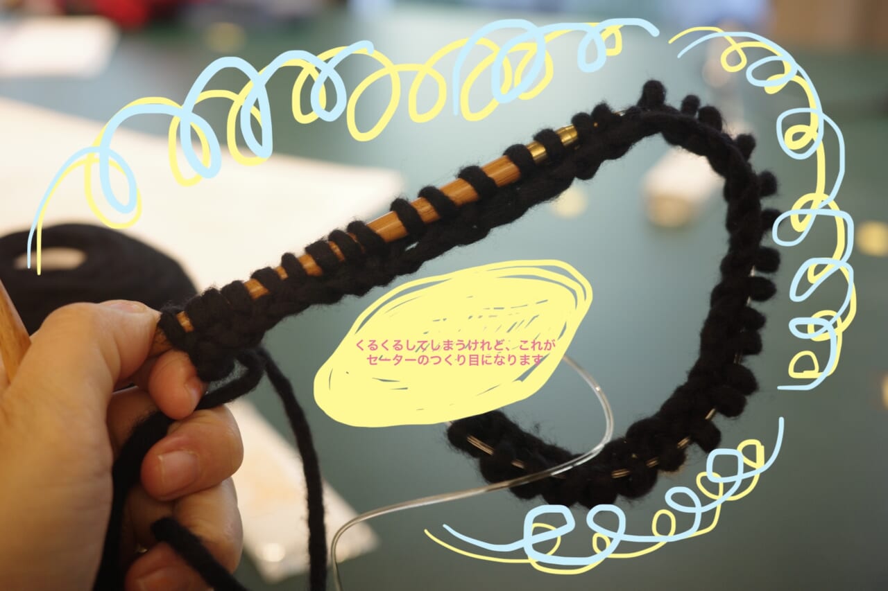 「3本ぐるぐる編みの場合は球がついていない編み針で編む」