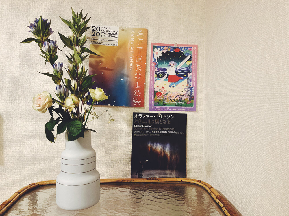 花瓶の隣には、お気に入りの展覧会や映画のチラシを