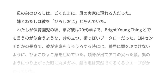 ガムがない時には、フランスから買って来たというヌードのカレンダーを渡されたこともある。70年代らしくソフトフォーカスの、金髪やブリュネットのヌード写真が12ヶ月分綴られているやつだ。わたしと妹がぽかんとしていると、美しいものを見る眼を養うためだ、でもまだ君たちには猫に小判だなとかなんとか言って、結局自分の部屋に持って行って吊るした。末っ子のひろしおじは親たちに可愛がられて、家を出た後もまだ子供部屋がそのまま残されていたのだ。