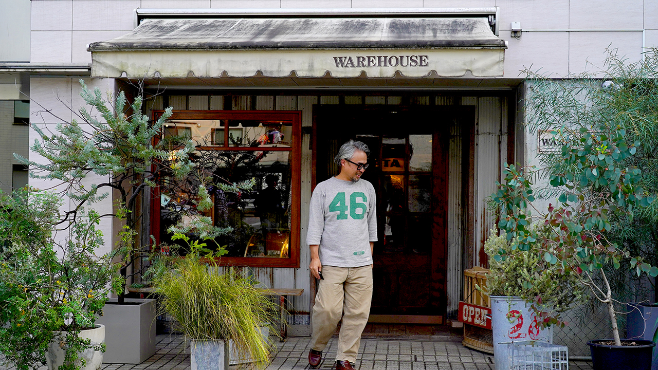 藤木さんが着ているのが、同じ緑色の顔料で染み込みプリントを施したウエアハウスのTシャツ。手前のTシャツと比べると経年の変化がよくわかります。