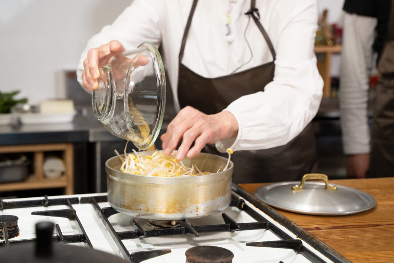 この部分に栄養がありますから。 - さて、お鍋に洗った豆もやしと
