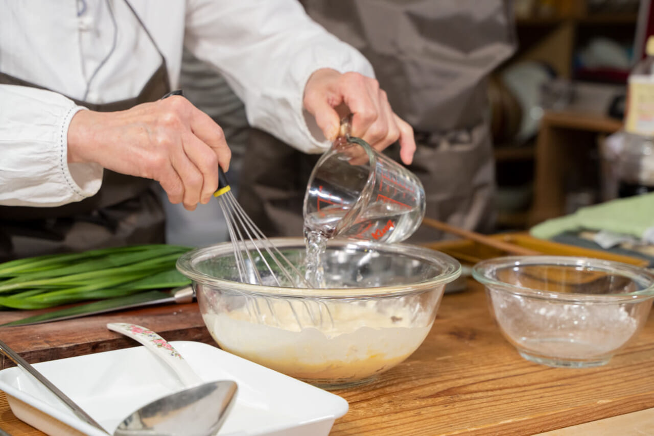 (2)小麦粉、卵、水、塩ひとつまみを入れて