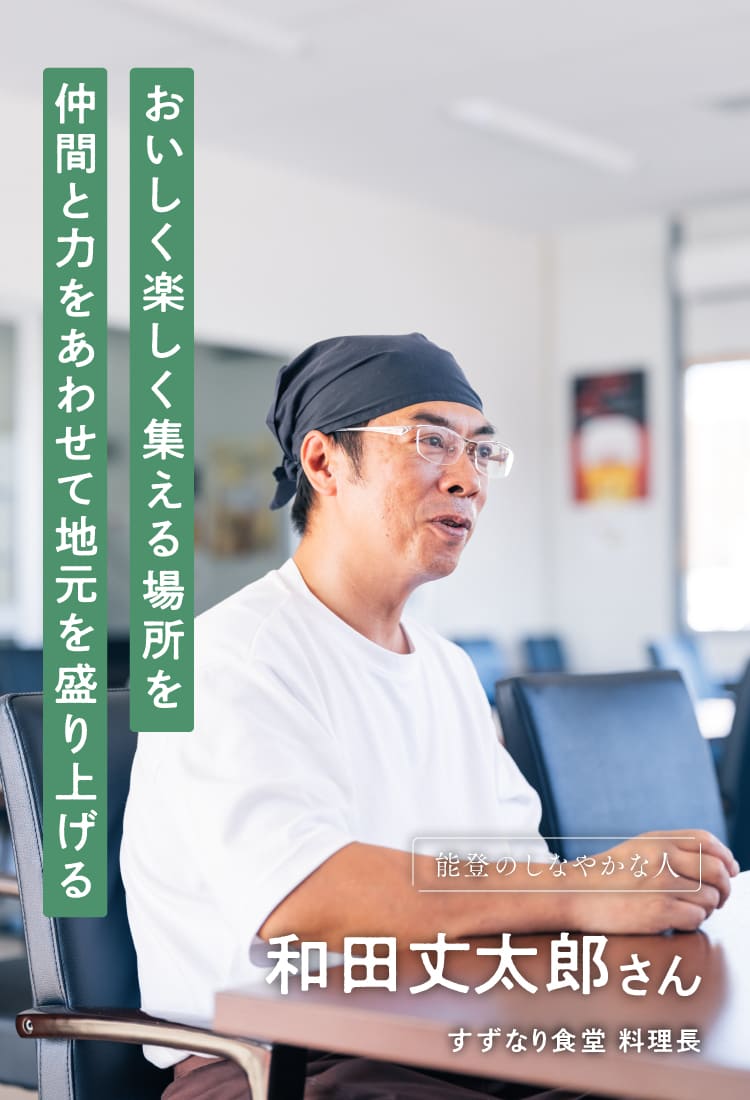 能登観光ホテルと庄屋の館を営む有限会社のとかんの代表取締役。経営者でもあり料理人でもある。被災後、合同会社すずキッチンの立ち上げメンバーのひとりとして、すずなり食堂とすずキッチンを盛り上げる。