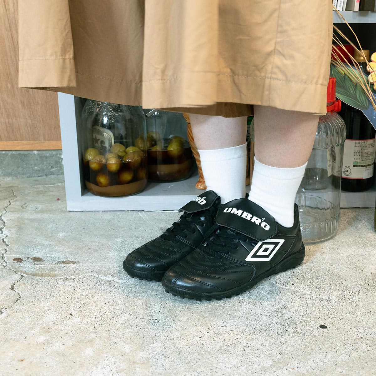 足元はサッカーシューズ風のスニーカー。