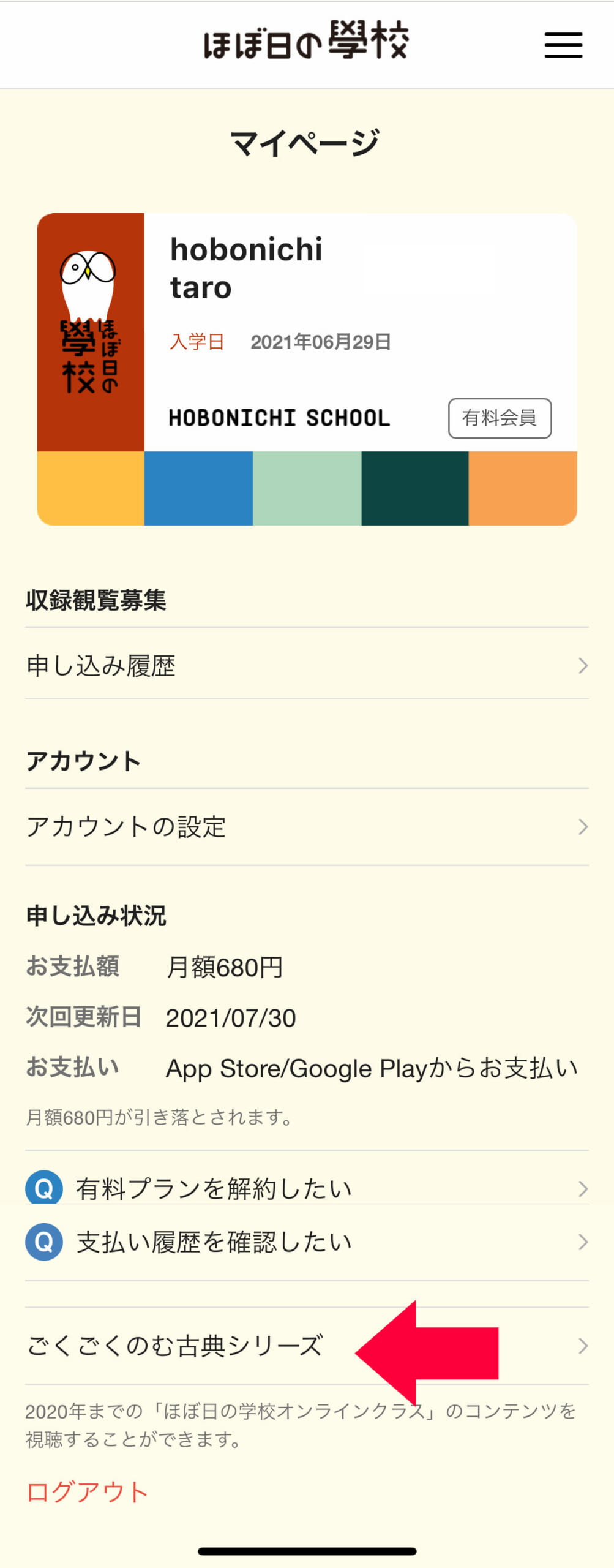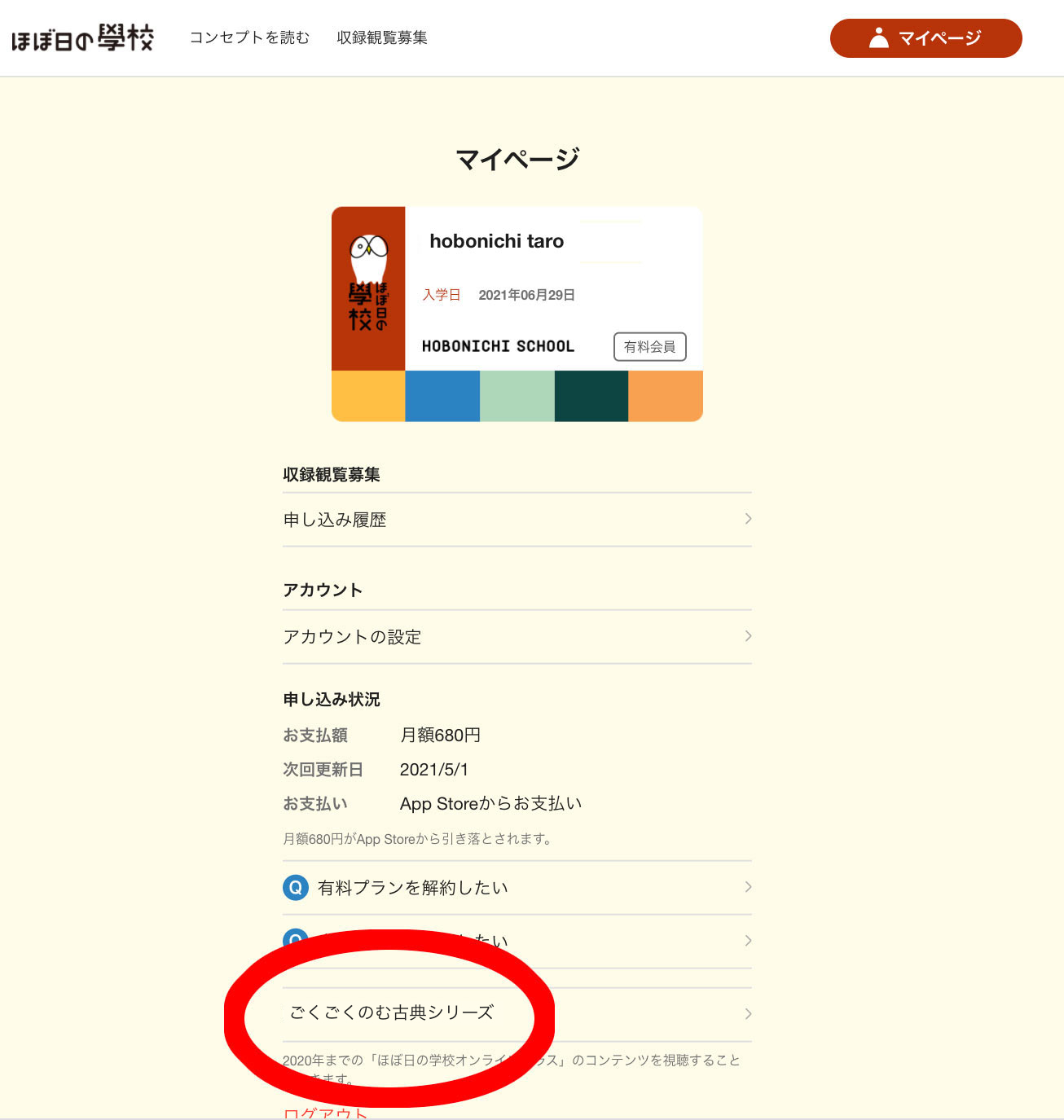3.マイページの「ごくごくのむ古典シリーズ」をタップ。