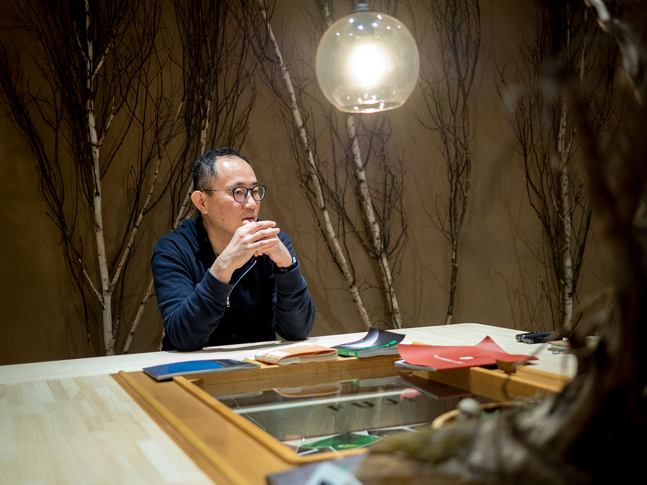 ▲サウナラボ神田の共有スペース。テーブルの上には、泥がついたままの木の根っこ。