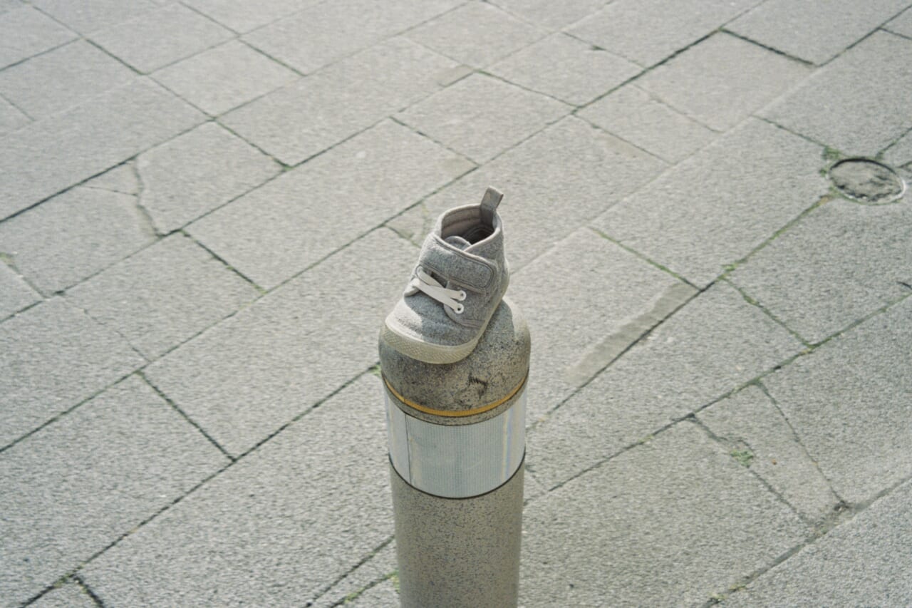 1時間ほどの実地調査を終え、われわれは出発地点の会場へ戻ってきた。すると、冷静沈着を旨とする調査員たちが色めき立っている。いったいどうした!? 今度は何が起こった!? 幾重もの人の輪をかいくぐっていくと、そこには、ちいさな靴が片方、車止めポールの上に置かれている。まるで「作品」が展示されているかのようだ。これみよがしに‥‥。出発の時点では、こんなもの、影も形もなかったのだ。きっと、スケーパーの「痕跡」にちがいない。あるいは「挑戦」か。