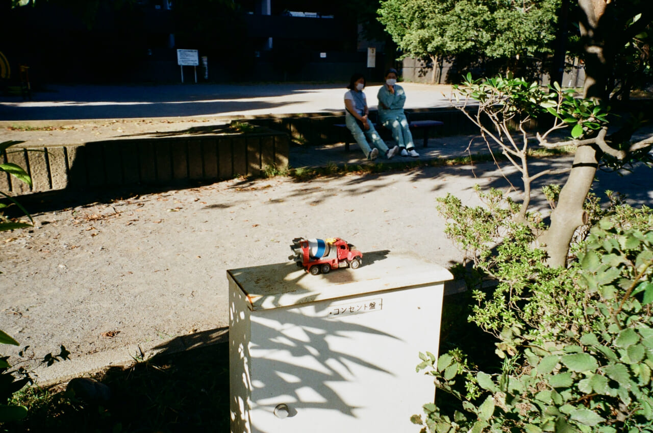 会場の外、ぽつんと置かれたミキサー車のおもちゃ‥‥の背後に注目してほしい。さっきの2人だ! 引き続き、困りごとの打ち明け話みたいな空気を醸し出している。たしかに、職場の人間関係は複雑だ。どこにでもある日常のひとコマだろう。しかし同時に、スケーパーである可能性が極めて高いと感じた。記者生活20余年の勘が、そう告げていた。それでも、やはり。スケーパーだと断定する術はない。ただの休憩中である可能性が、どうしても捨てきれない。