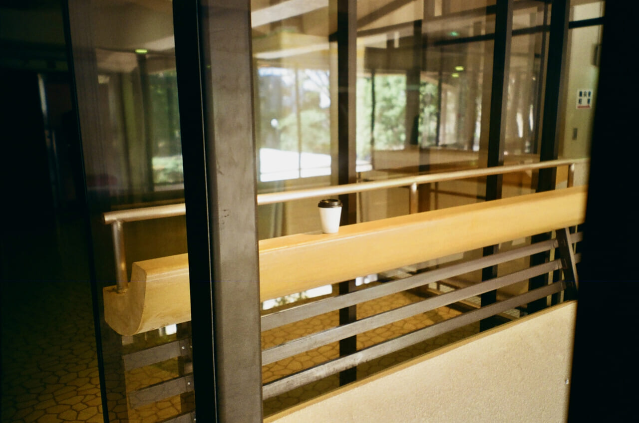 はめ殺しの窓の外、手の届かない場所に置かれたコーヒー。