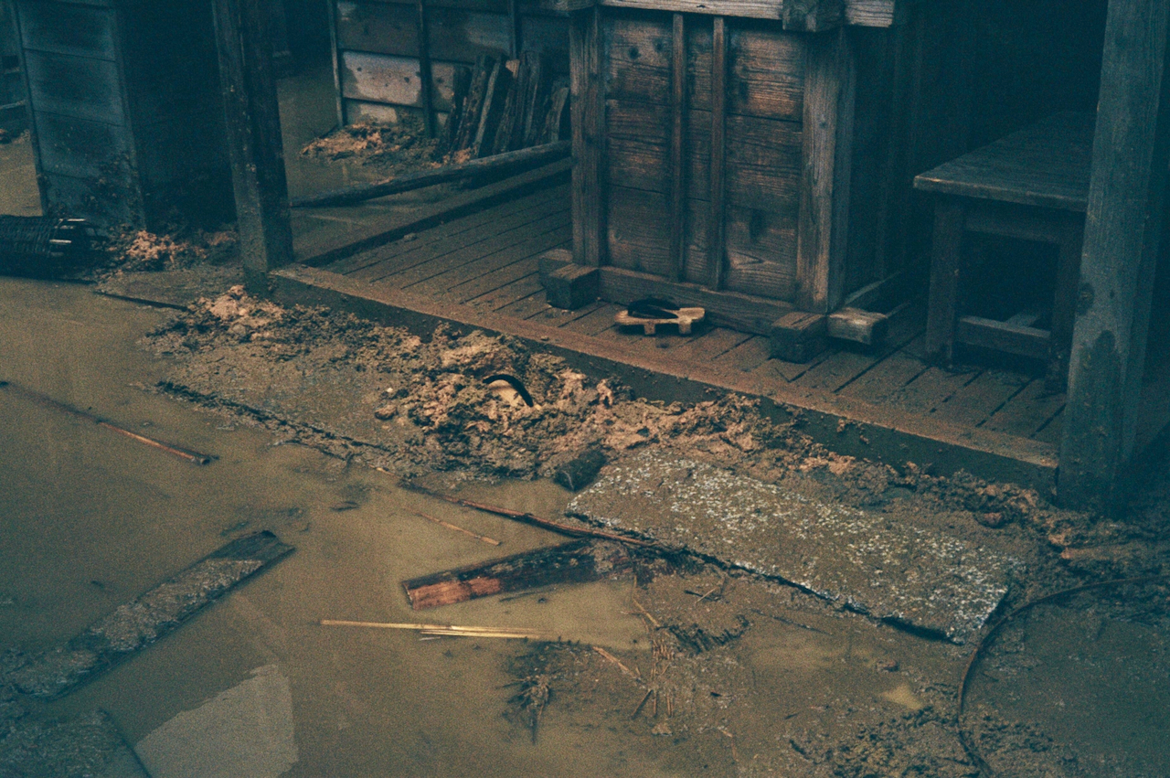 撮っているのは、昨日の大雨の翌日のシーン。路地に水が撒かれており、あたり一面ぐちゃぐちゃだ。雨のせいで、長屋の共同便所から「う○ち」が路地に溢れてしまったという、地獄の場面。今回の映画はモノクロなので「土」と「う○ち」の質感の違いをどう表現するかが、美術スタッフの課題だったという。肥溜めに落ちた経験のある自分の目にも「そうそう、そうだよね」という出来栄え(我ながら、なぜそんなにえらそうなのか!?)。当初はダンボールを混ぜていたそうだが、環境的な配慮から別の素材に切り替えたとのこと。何でできているかは、教えてもらえなかった。