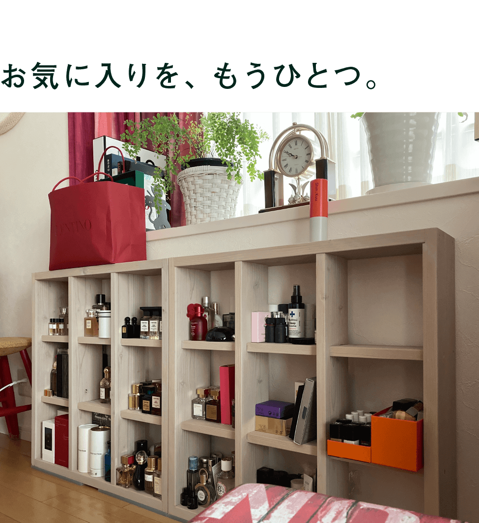 仕事柄、日々増殖するフレグランスの置き場に困っていたのですが、ネットでぴったりな格子ラックを見つけました。杉足場板を再利用した、いまどきにアップサイクルな棚です。ふたつ買って連結させたのもナイス! と、ひとり悦に入りまくりの今日この頃。
