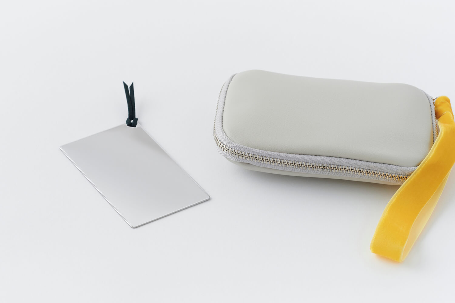 なめらかなベージュの生地に、シンクーのブランドカラーのひとつである、イエローのベロア調の引き手付き。サイズ 横130×縦85×厚さ17mm ※実際の製品は、寸法に若干の個体差があります。