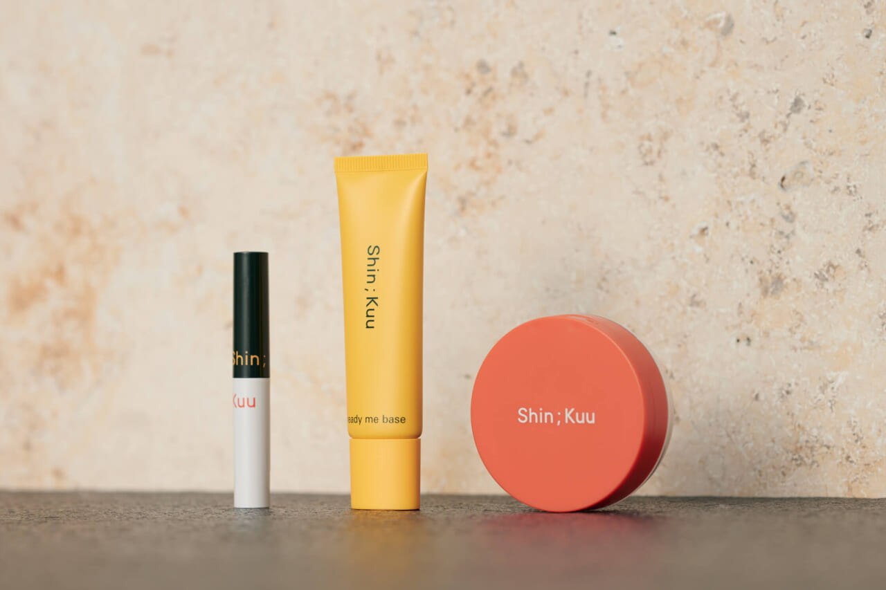 レディー ミー ベース(中央)。少量ずつ出して使いやすいチューブタイプ。右はレディー ミー パウダー。ミラーとパフが内蔵されていて使いやすい。左はバームスティック ザ・ファイブから、コンシーラー。