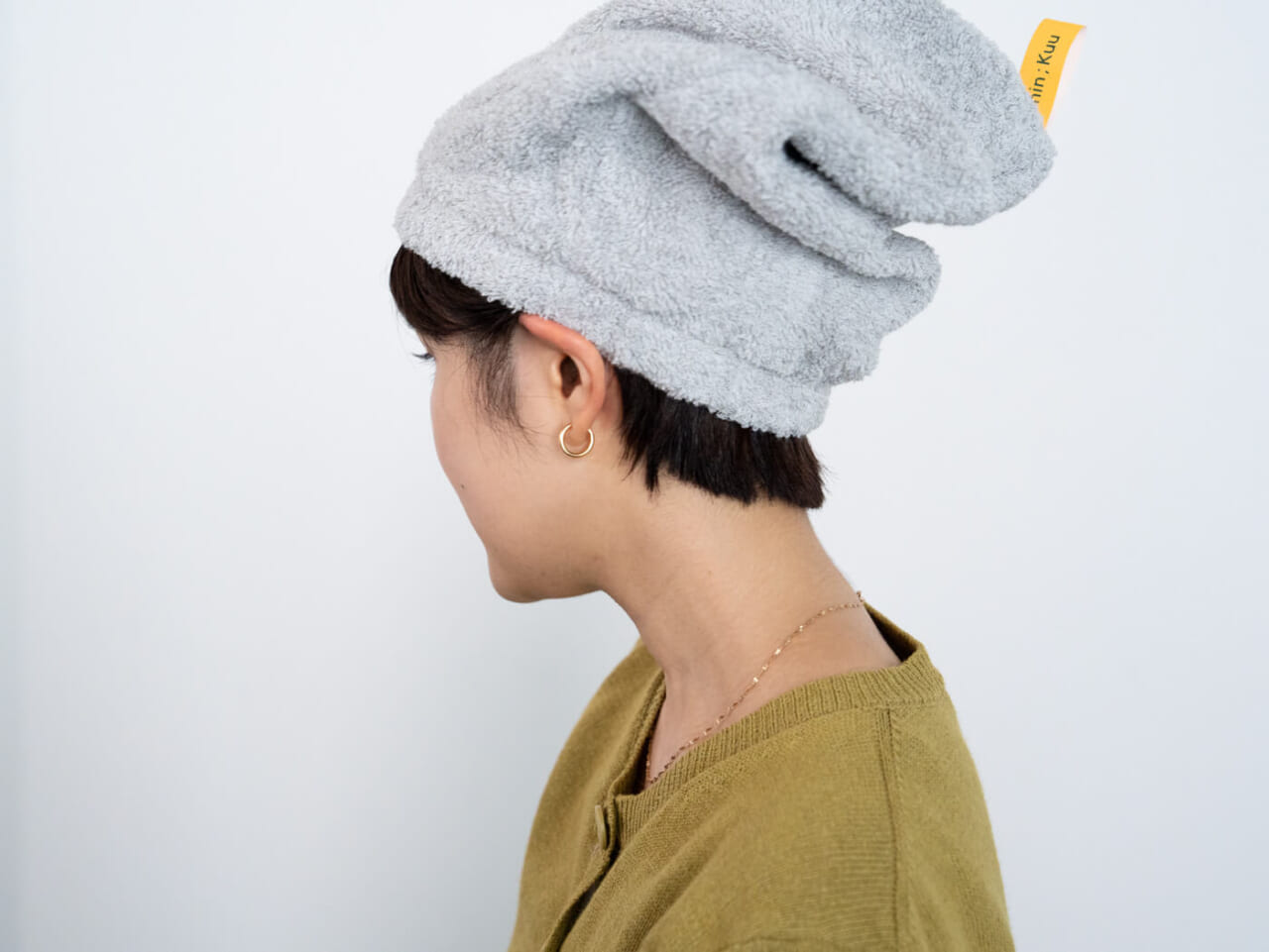 お風呂上がりに濡れた髪をタオルキャップに包んで、