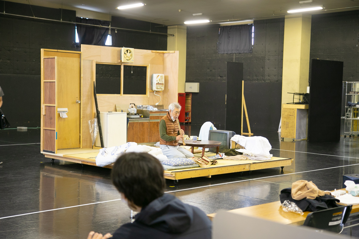 稽古場という空間に、はじめて入る。新型コロナウィルスの感染防止のため「検温・手の消毒・マスクの交換・着替え・内履きへの履き替え」をしないと中へ入れてもらえない。もちろん飲食は禁止、差し入れもご遠慮とのこと。徹底している。13時すこし前に到着したときには、俳優さんはじめ全員がそろっていた。誰なのかわからなかったはずだが、高杉真宙さんが、とてもていねいに挨拶してくださった(この時点ではきちんと自己紹介できておらず、あの人たまにいるけど誰なんだろうという状態)。見ると、セットがふたつ組まれている。かたや万年床が敷かれたボロアパートの北向きの六畳一間(風)。かたや、ミース・ファン・デル・ローエの革張りソファが鎮座する、タワーマンションの見晴らし最高のリビング(的空間)。今日は、このセットを使って稽古するのかと思いきや、使わない。俳優たちは、一週間前の「本読み」と同じくテーブルへ座り、台本に目を落とす。「まァ、やってみましょう」と、柄本さん。稽古場での初日も「本読み」ではじまった。
