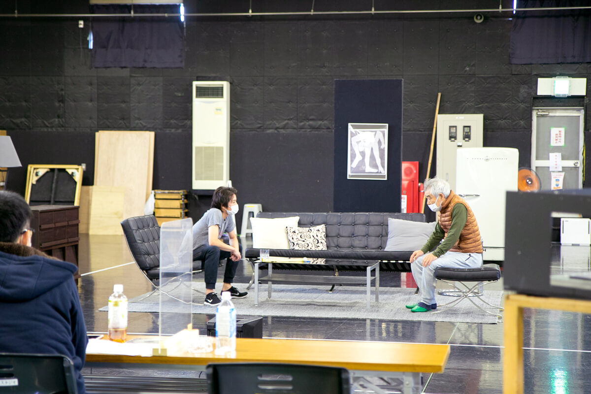 柄本さんが、重そうな綿の布団をけっとばし、万年床から跳ね起きる。物語の冒頭、柄本さんのオンボロアパートに藤原竜也さんが訪ねてくるシーンだ。今回の取材は初体験のことばかりなので、こうして「立ち稽古」を見るのも、はじめて。藤原竜也と柄本明という大きな俳優が、ほんの数メートル先で対峙し、いまにも物語をうみだそうとしている。誰かの中に、ずっと残ることになるかもしれない物語を。‥‥と考えると、あらためて、すごい場所だと思う。