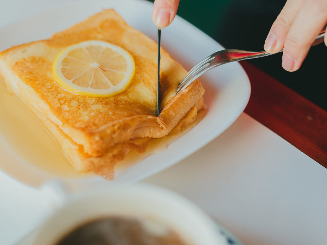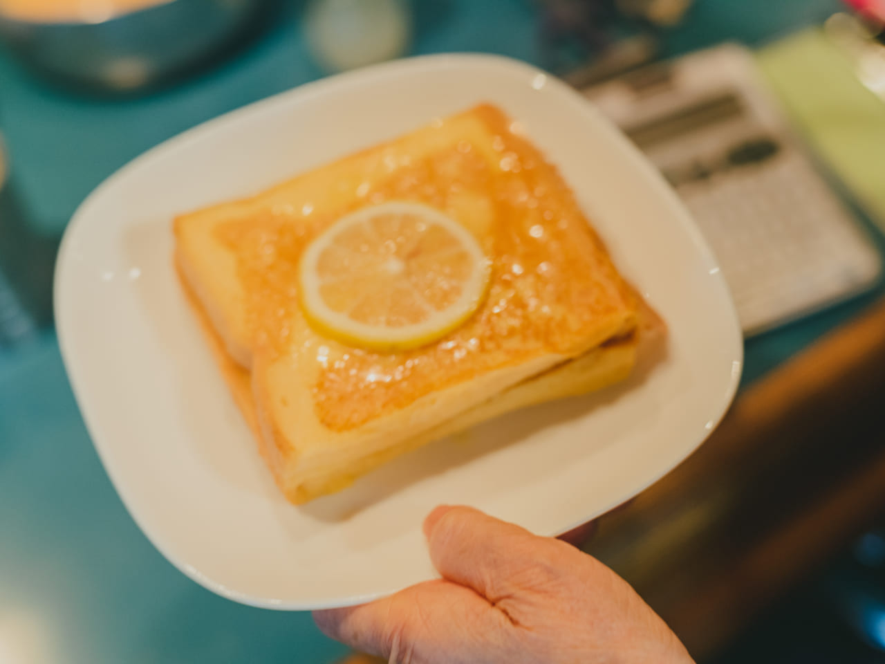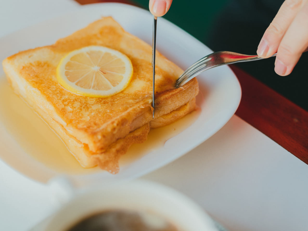 輪切りのレモンがかわいらしいフレンチトースト。ナイフを入れると、もちもちの生地に染み込んだシロップが「じゅわあ」と出てきます。たまらないです‥‥。