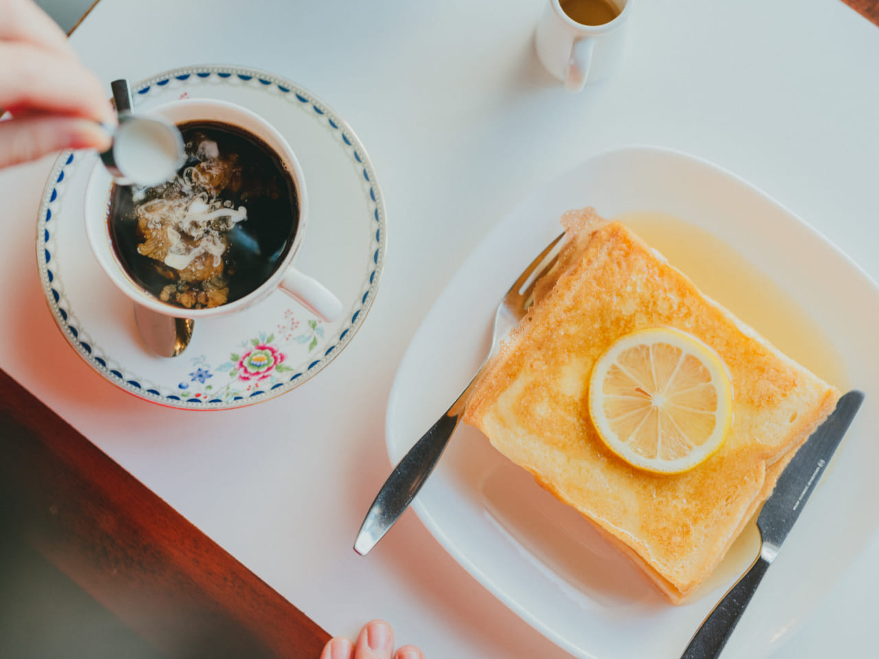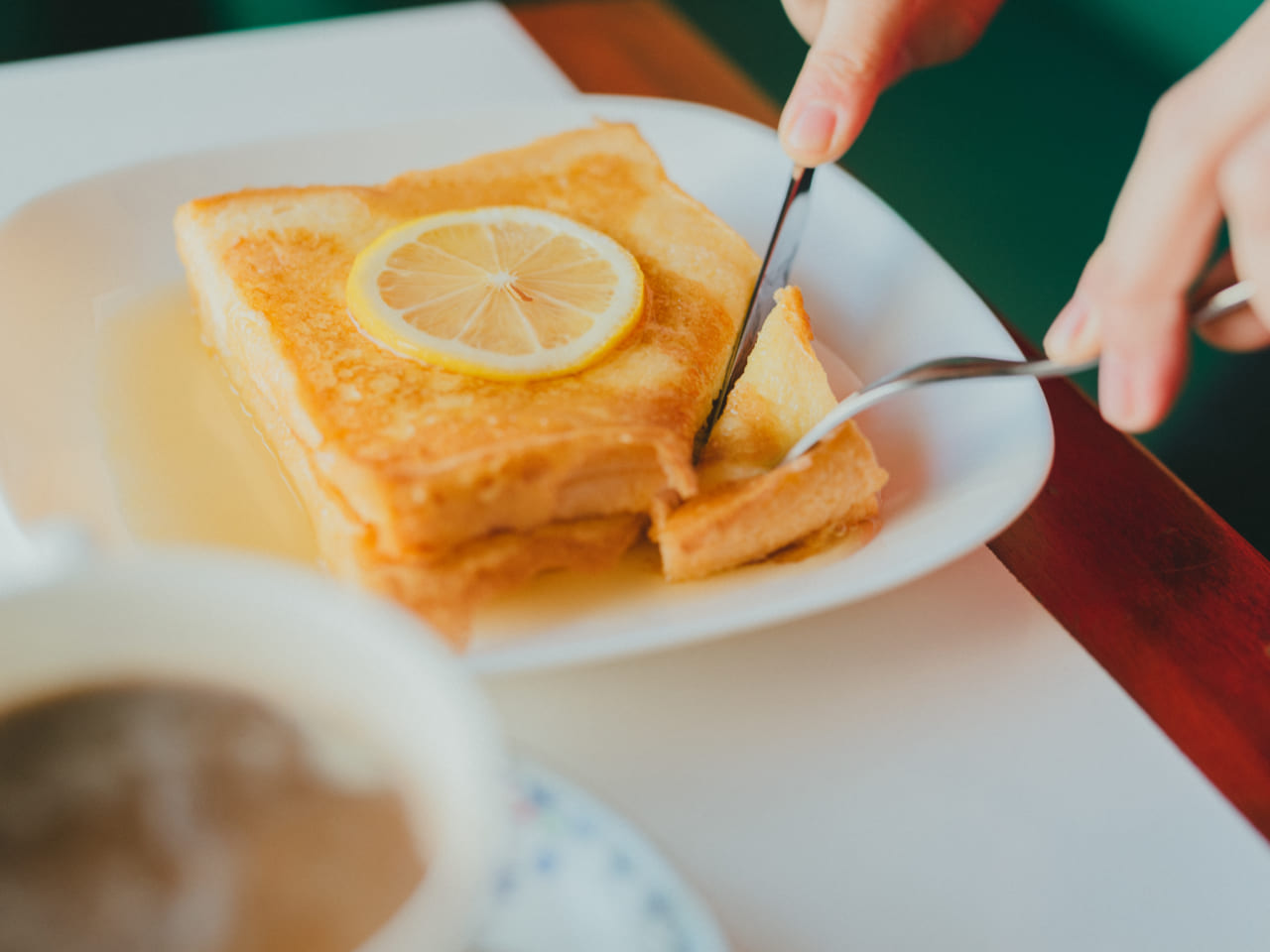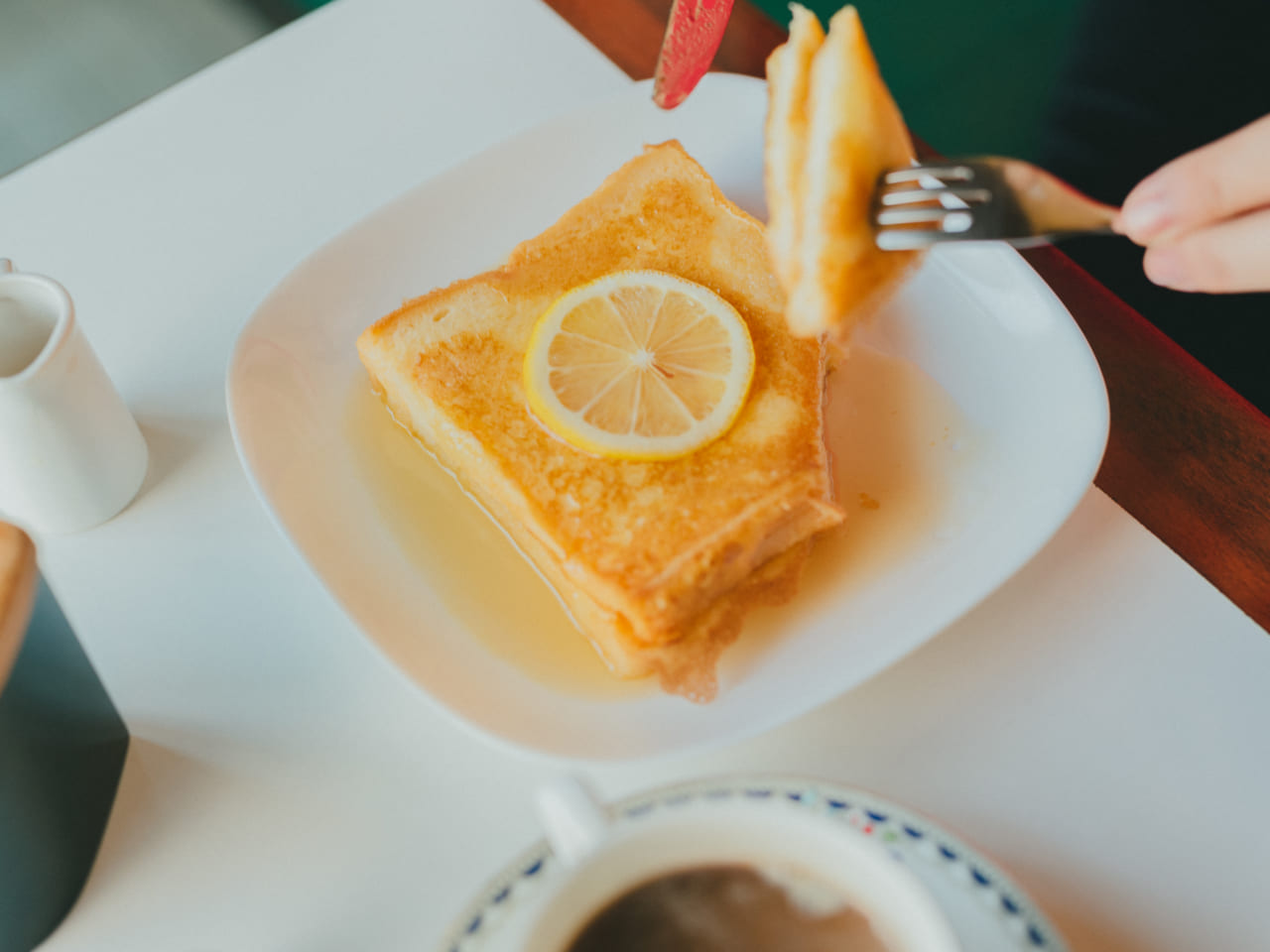 輪切りのレモンがかわいらしいフレンチトースト。ナイフを入れると、もちもちの生地に染み込んだシロップが「じゅわあ」と出てきます。たまらないです‥‥。