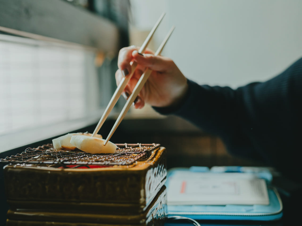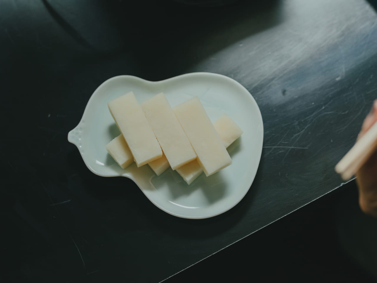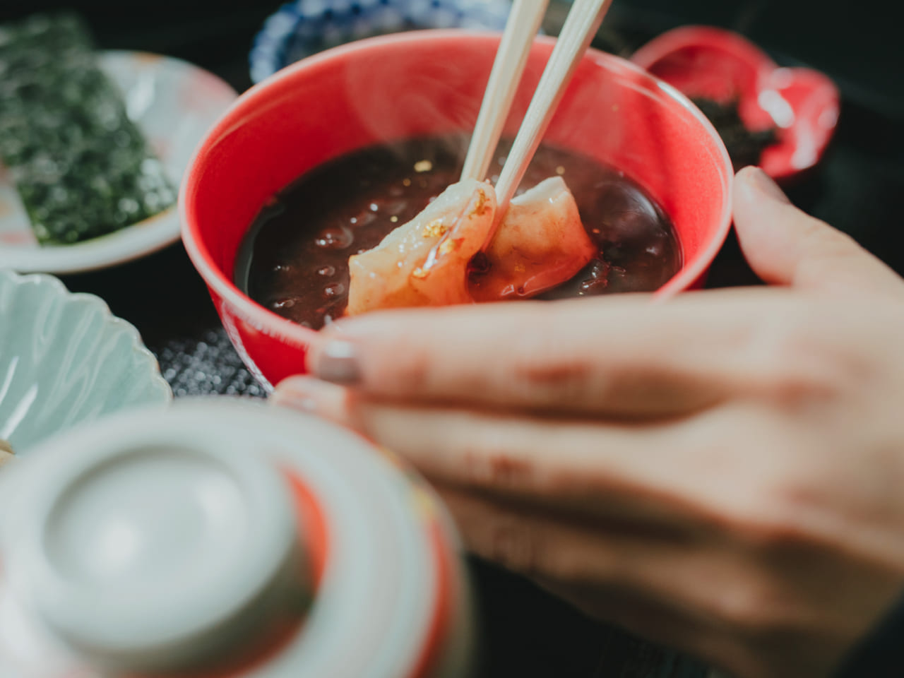 - 3個め、手前のお湯にお餅をくぐらせたあと、