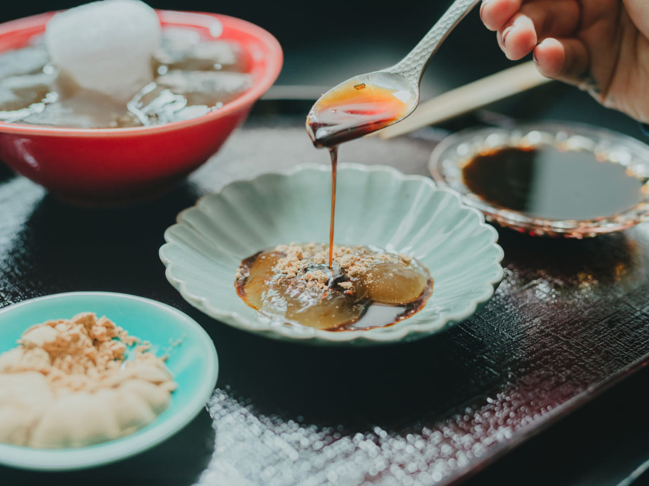 菊の形のきな粉と、黒蜜をたっぷりつけてどうぞ。