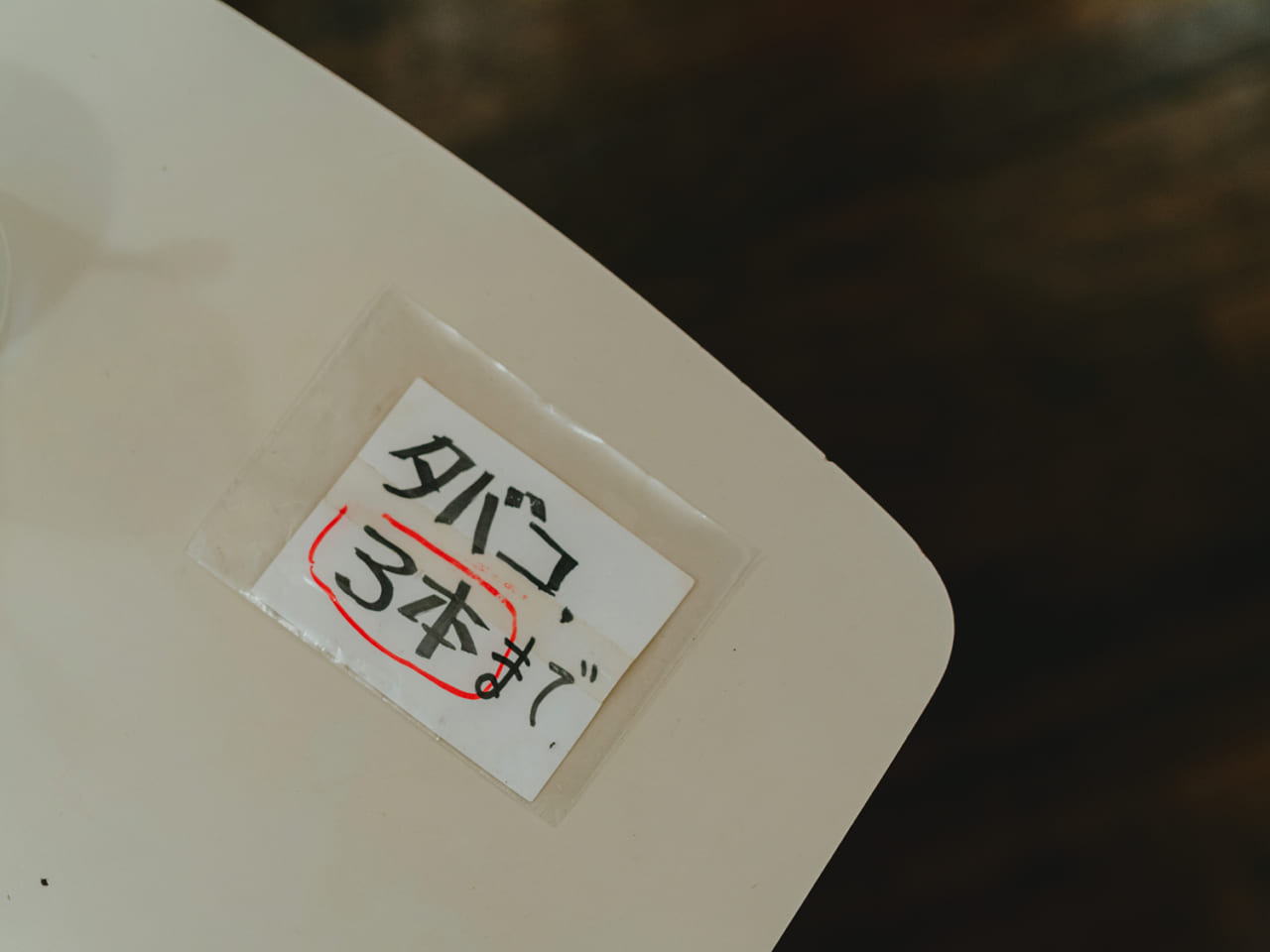 「寝ないでください」「たばこは3本まで」の張り紙。