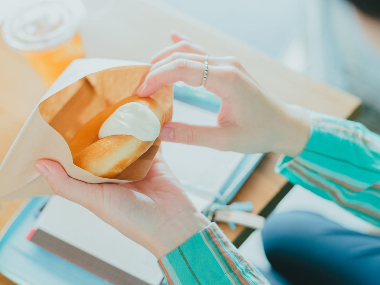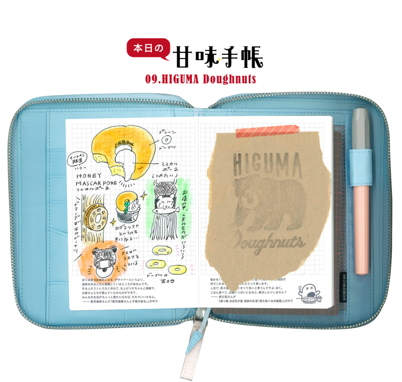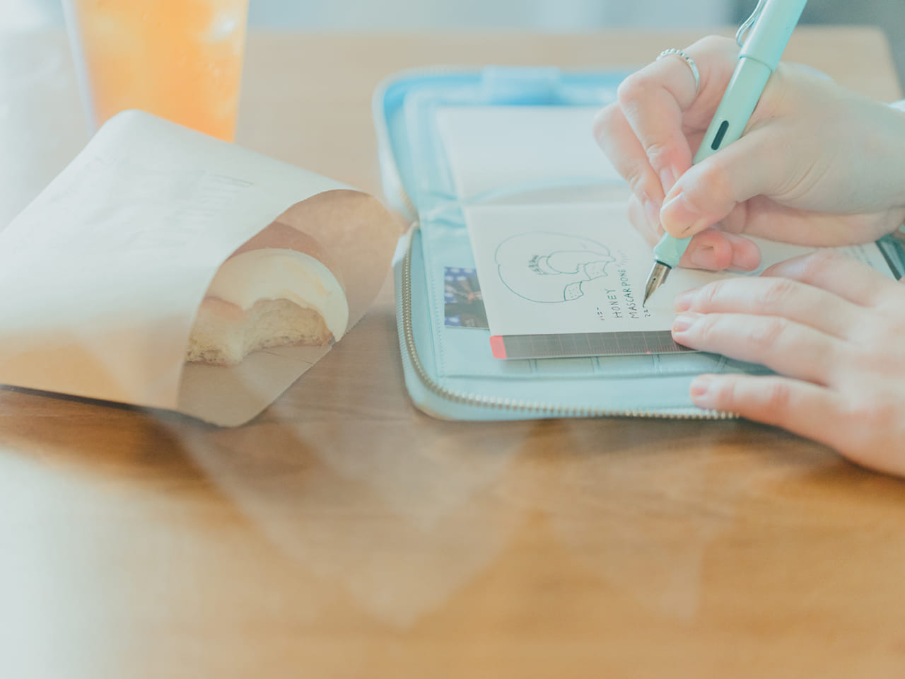 揚げ油の中に丸型のドーナツ生地がぷかぷかと浮かぶ様子が可愛くて、背伸びをして厨房をじーっと見てしまいました。くるんとひっくり返したら見事なきつね色!お店の方からドーナツを受け取ったら、写真も絵も後回しにして、揚げたてのうちにまずガブリ。手帳に描いたドーナツが欠けているのは、そのせいです。