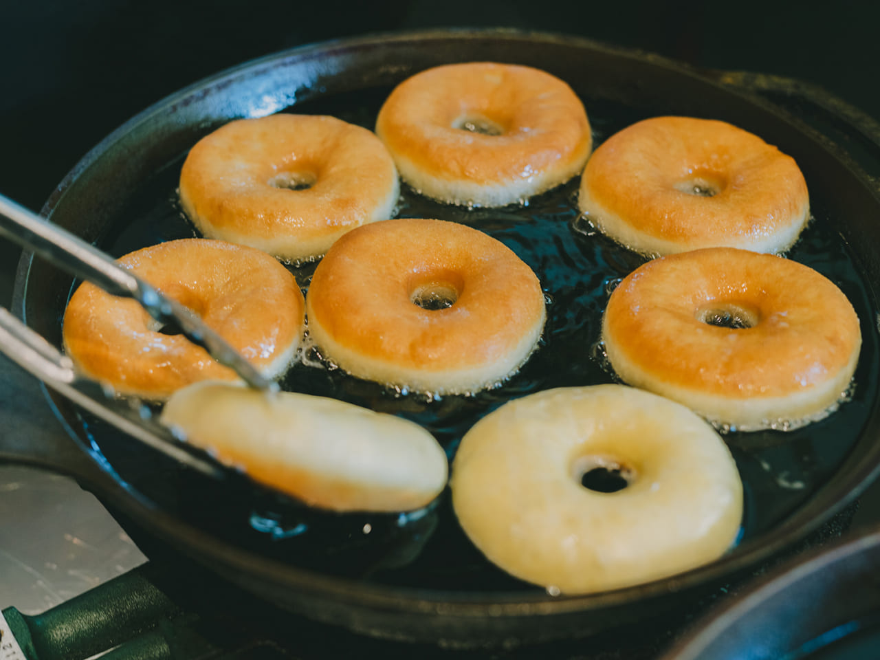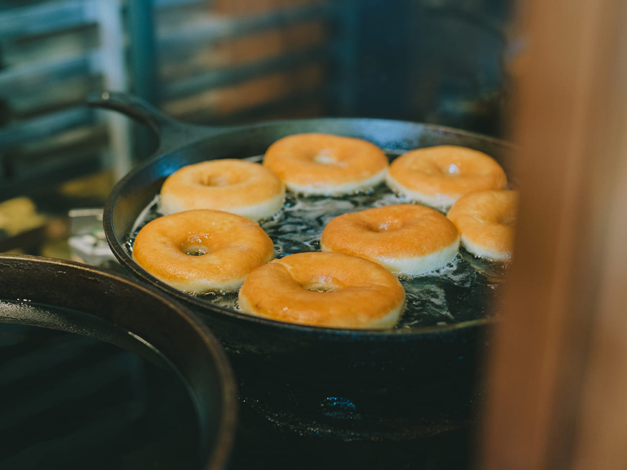 - 白いドーナッツが油に浮かべられて、