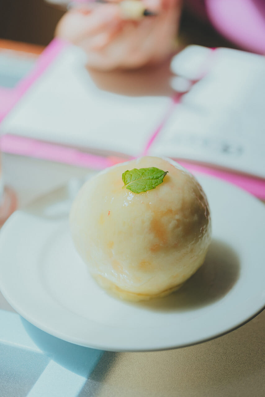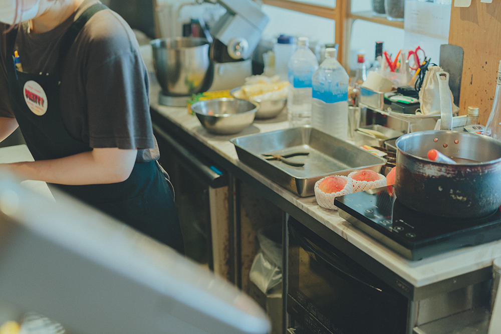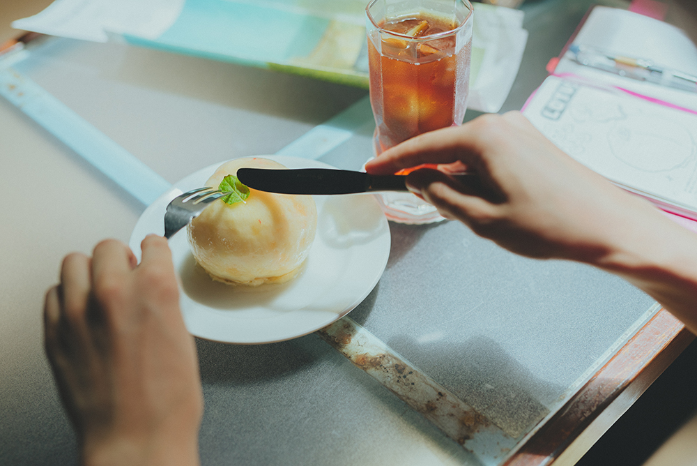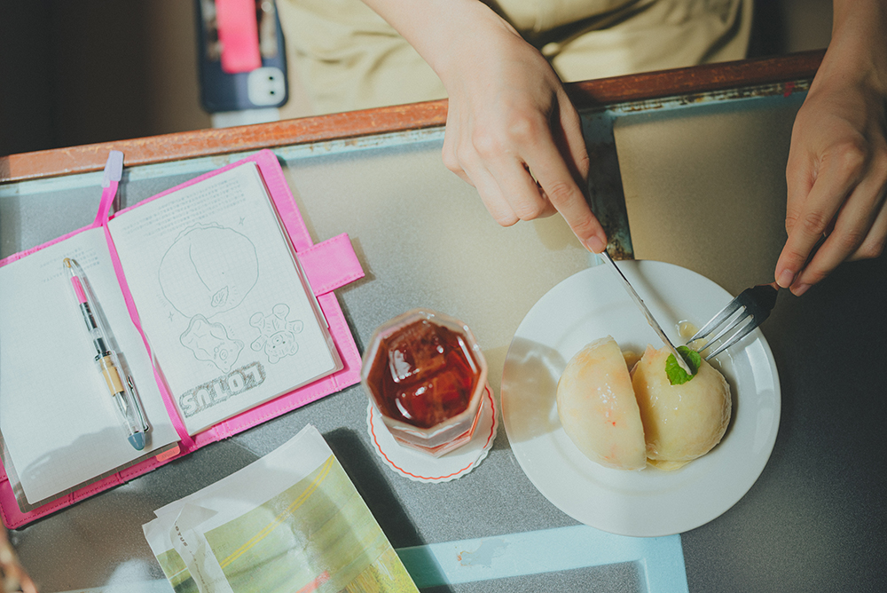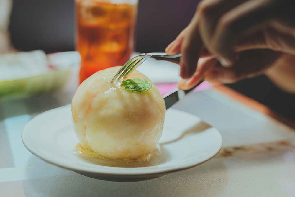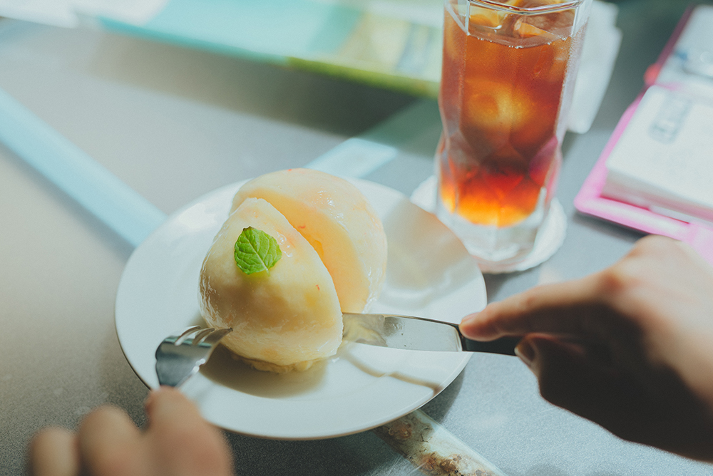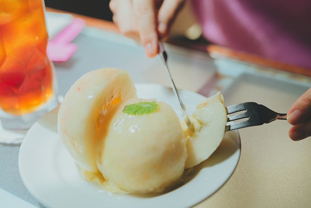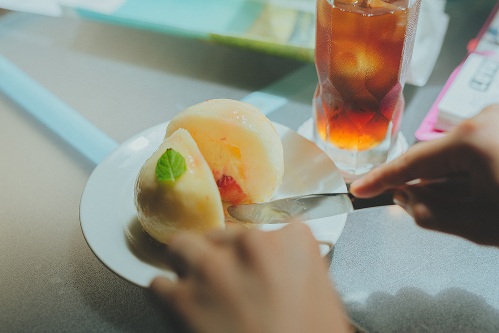 目の前にツヤツヤ光る桃が置かれたときの高揚感。ナイフを入れるのをためらう気持ちと、早く食べたい気持ち。大きめに切って頬張って、口の中が桃やカスタードクリームの味でいっぱいになったときのあのうれしさ‥‥ああ、思い出していたら、もういちど食べたくなってしまいました。それにしても、「まるごと」っていい言葉だなあ。