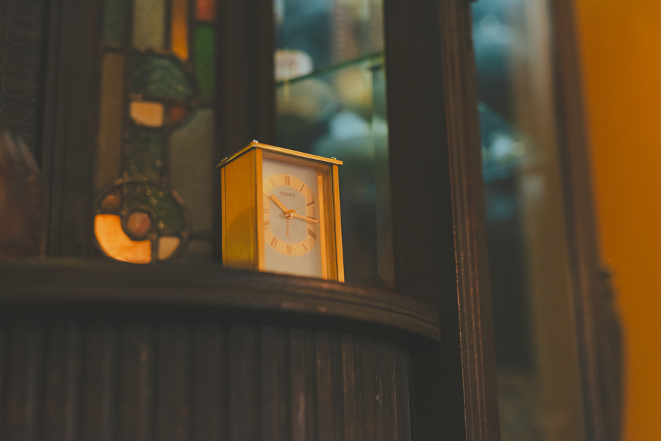 食後にぼうっとしていたら、別のお客さんが「アンプレスひとつ」とオーダー。バターが溶けるいい音と美味しいにおいを、もう一度楽しみました。ほどよい暗さの店内に、やさしく光るステンドグラスの灯りとショパンの音色。居心地が良くて去りがたい、隠れ家のような喫茶店です。