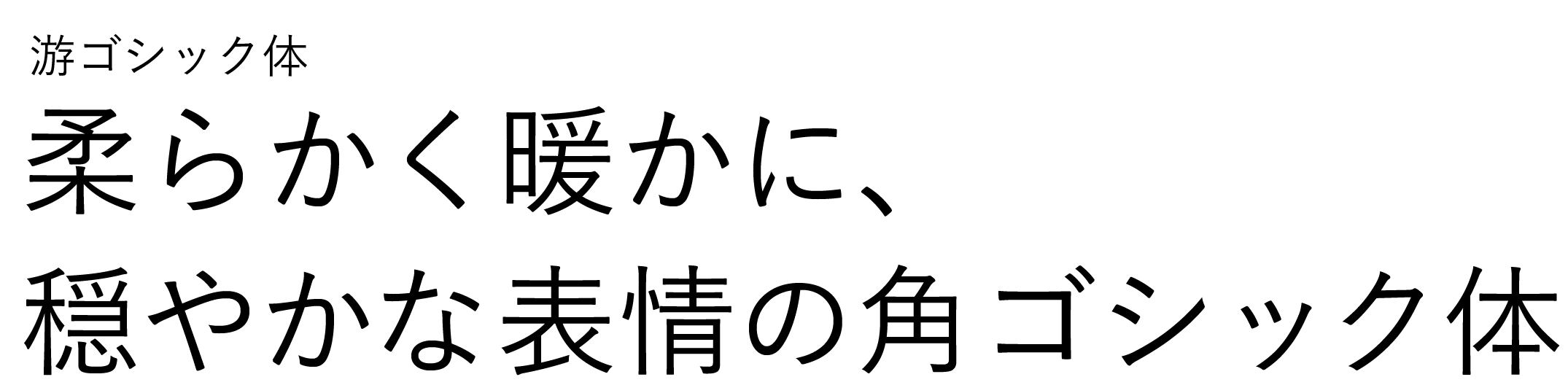 游明朝体と一緒に使うことを想定して開発された、スタンダードな角ゴシック体です。 ややフトコロがせまい漢字と、伝統的なスタイルを持ったすこし小さな仮名の組み合わせが特徴です。