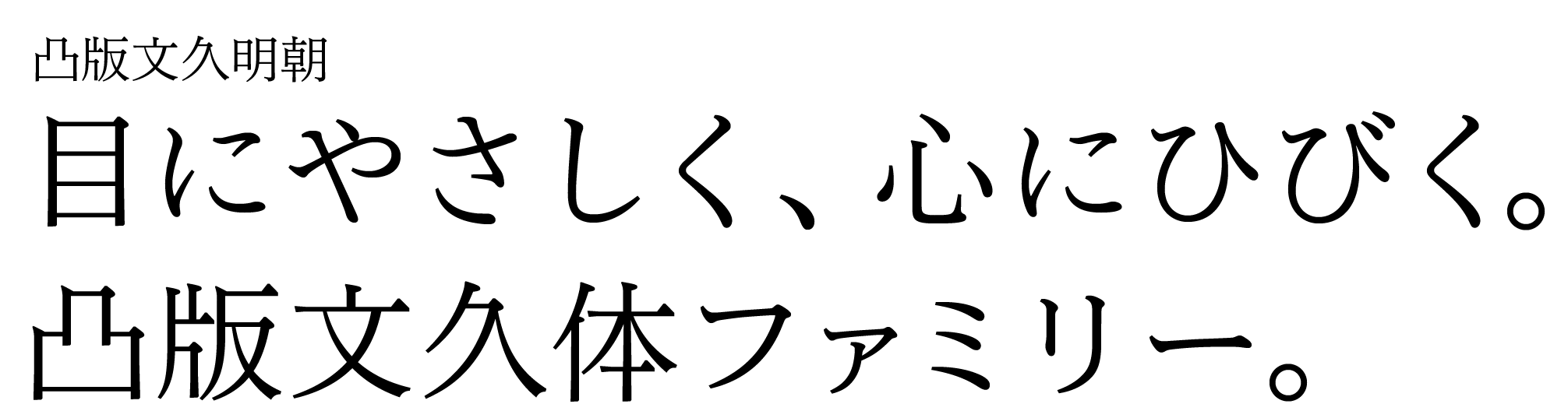 縦組みの読みやすさを第一に考えて作られました。戦前から受け継いできた凸版明朝体をベースに、現代に合うように明るく平明に磨きあげています。文字がもつ本来の形を活かした抑揚のあるデザインで、読むリズムを演出するように設計しています。