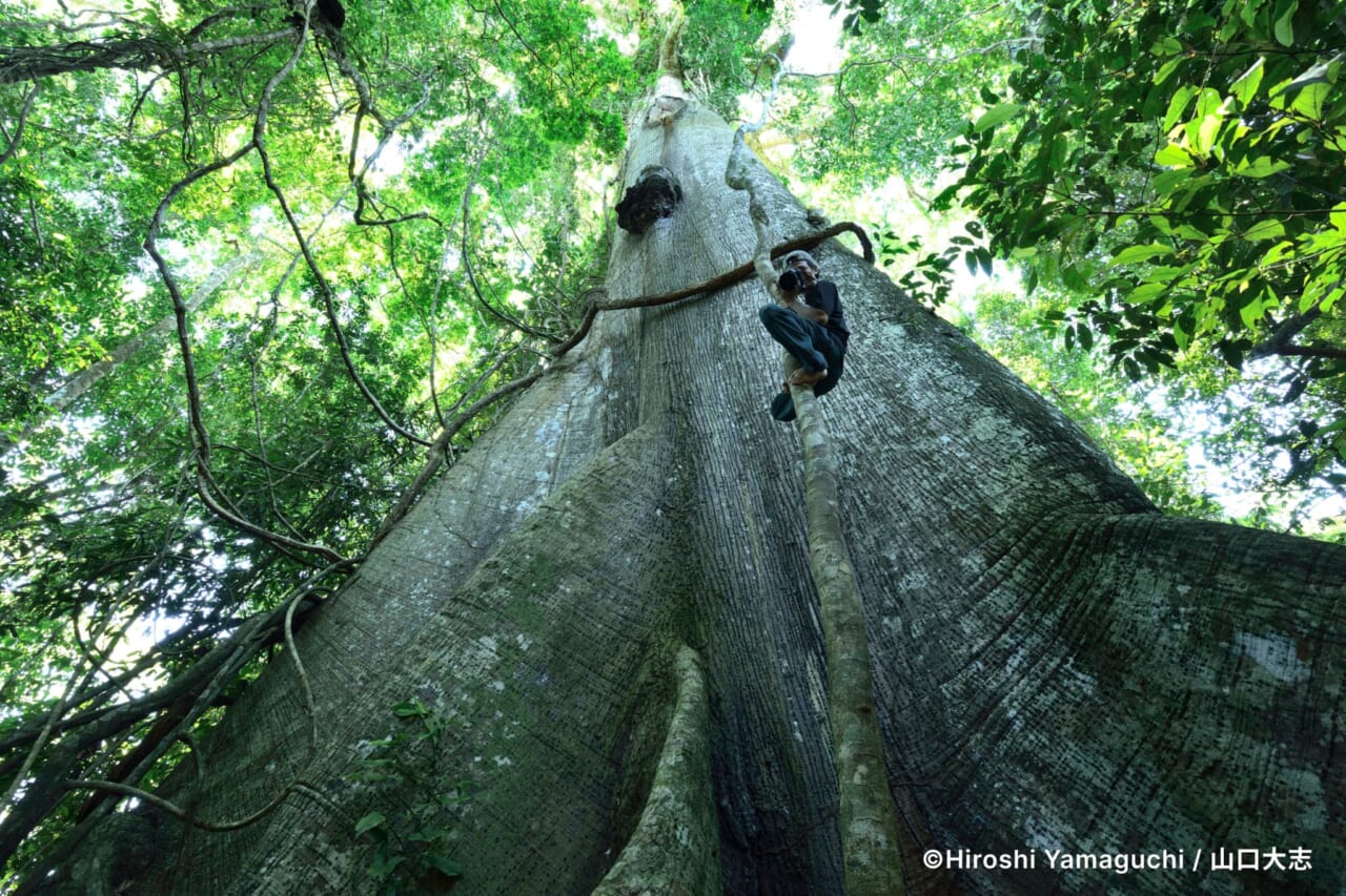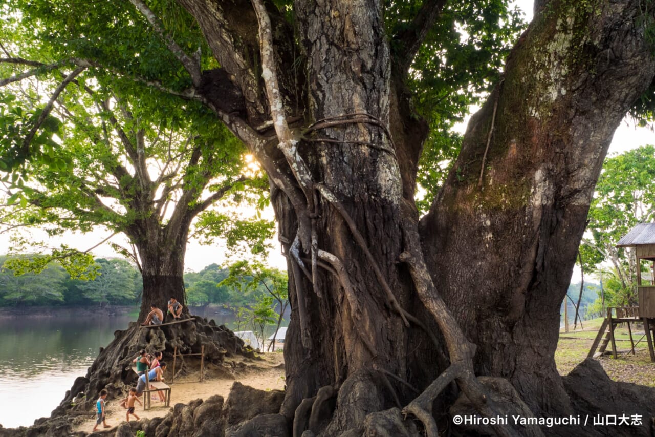 大きな木はブラジルナッツの木です。 - 夕方、撮影が終わって川岸で休んでいたら、