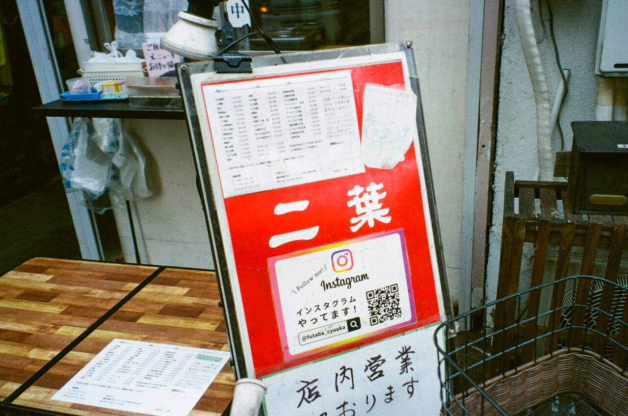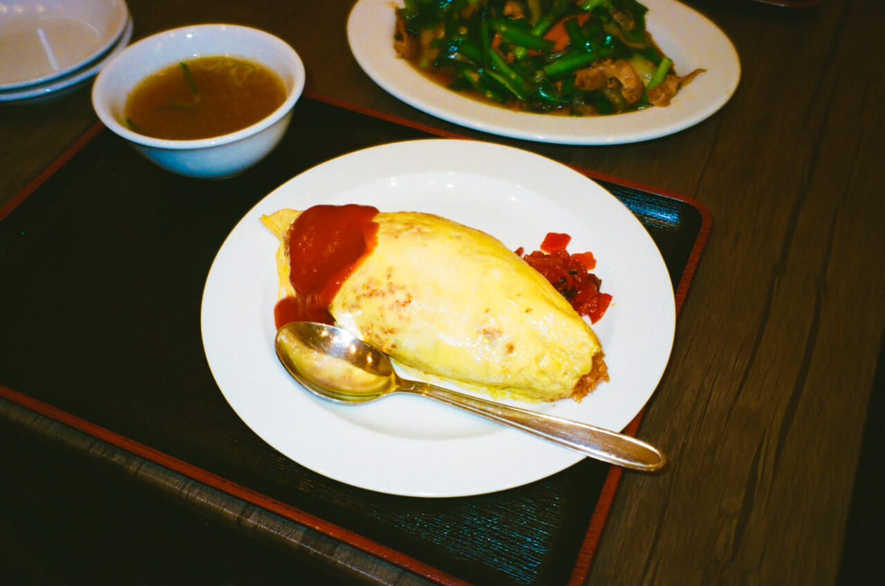 やっぱりオムライスかな。大盛りにしようかどうかで悩む‥‥‥(長考)。決めた。今日はふつう盛りと肉ニラ炒め単品でいきます! 二葉って、ステーキハウスのリベラと並んで学大のシンボルみたいな店なんです。でも、幼稚園のころから学大に住んでるのに、30過ぎになるまで入ったことなかったんですよ。だから、だいぶ大人になってからなんです、ぼくの二葉デビューって。しかも北海道から来た友人に連れてきてもらった(笑)。それ以来、失われた時間を取り戻すかのように通ってます。頼むのは、だいたいオムライスですね。いろいろうまいんだけど、いつのまにかそこへ着地してました。ラーメンもいいんで、オムライスだけじゃもの足りないときは勝手にセット気分で注文してます。いま、いろんなタイプがあるじゃないですか、オムライスって。チキンライスの上に載っけたオムレツをパカッと開くとトロトロの中身が出てくるやつとか。上野のたいめいけんの「たんぽぽオムライス伊丹十三風」的なね。あっちもおいしいんだけど、ぼくはこっちのほうが好き。「ザ・オムライス」のドッシリ感。チキンライスも含めてしっかりした味付けで、空きっ腹にドッシーリくる感じ。