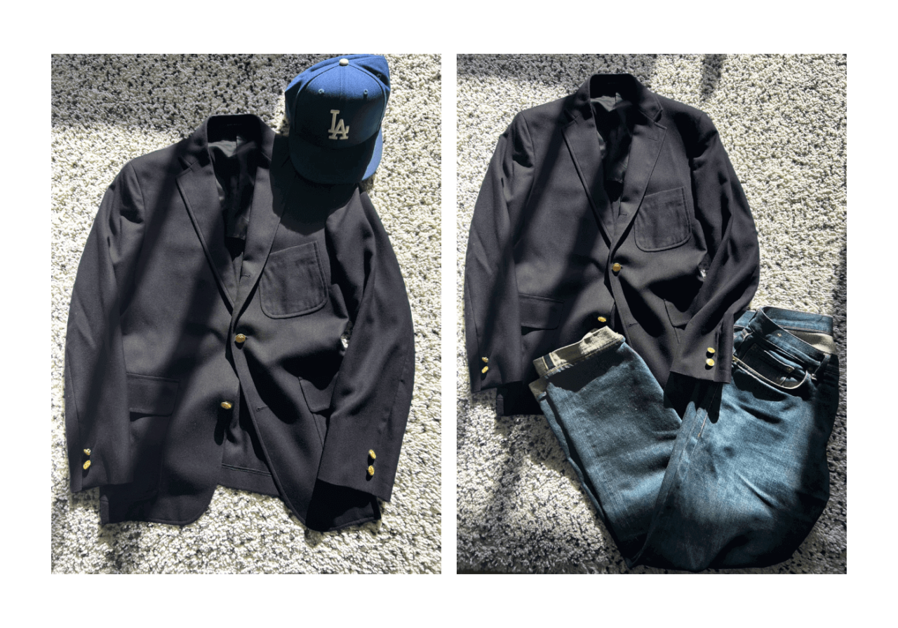 紺ブレはじめジャケットを着るときには「こなれた感じ」をどう出すかが重要だと思います。そのとき、好きなブランドのものを手に入れてみるのはひとつの方法。ぼくは、サウスウィックというアメリカのファクトリーブランドが好きでよく着てるんですが、いま、80年代のサウスウィック製ブルックスブラザースのスーツが気になってる。自分にとって「なじみ深い、着やすいブランド」から探す、ということですね。写真の紺ブレもシップスが復刻したサウスウィックのもの。これをいつものデニムと合わせるだけで、ふだんの自分と変わらないスタイルに落とし込めるはずです。また「小物使い」も効果的ですね。ぼくの場合は、ベースボールキャップとか。いつも身につけているアイテムをプラスするだけで「着られちゃってる感じ」は薄らいでいくと思う。ふだん使っているリュックを肩にかけたり、ずっと身につけている腕時計を「外さない」だけでも、服が自分にグッと近づいてくるはず。相手が「ジャケット」だからといって、他人行儀ではうまくいきません。あまり深く考えず、いつもの格好にパッと合わせるだけで正解なこともけっこうありますよ。