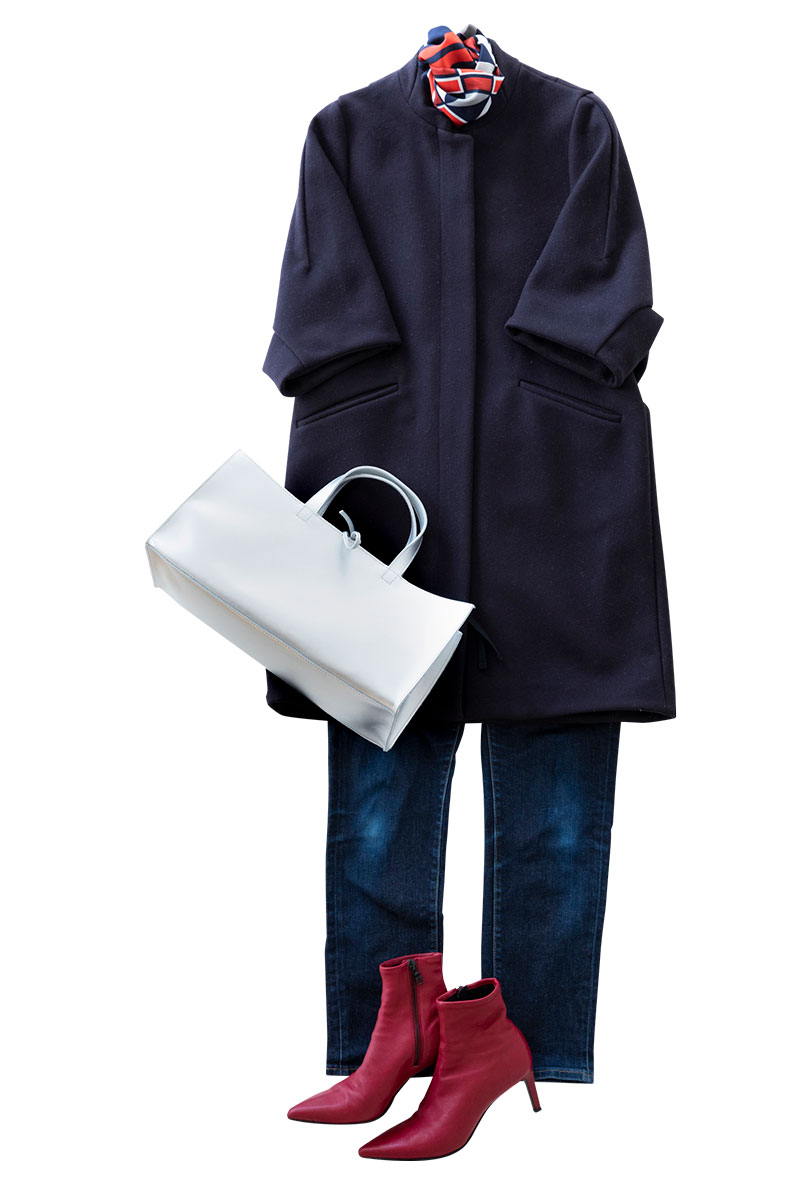 足元は赤いブーティーにすれば、冬のおしゃれが完成です。