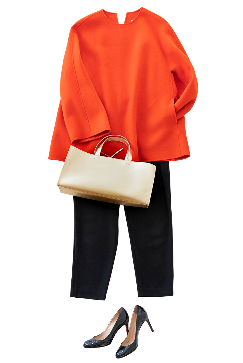 赤いプルオーバーに黒いパンツ、黒のヒール。