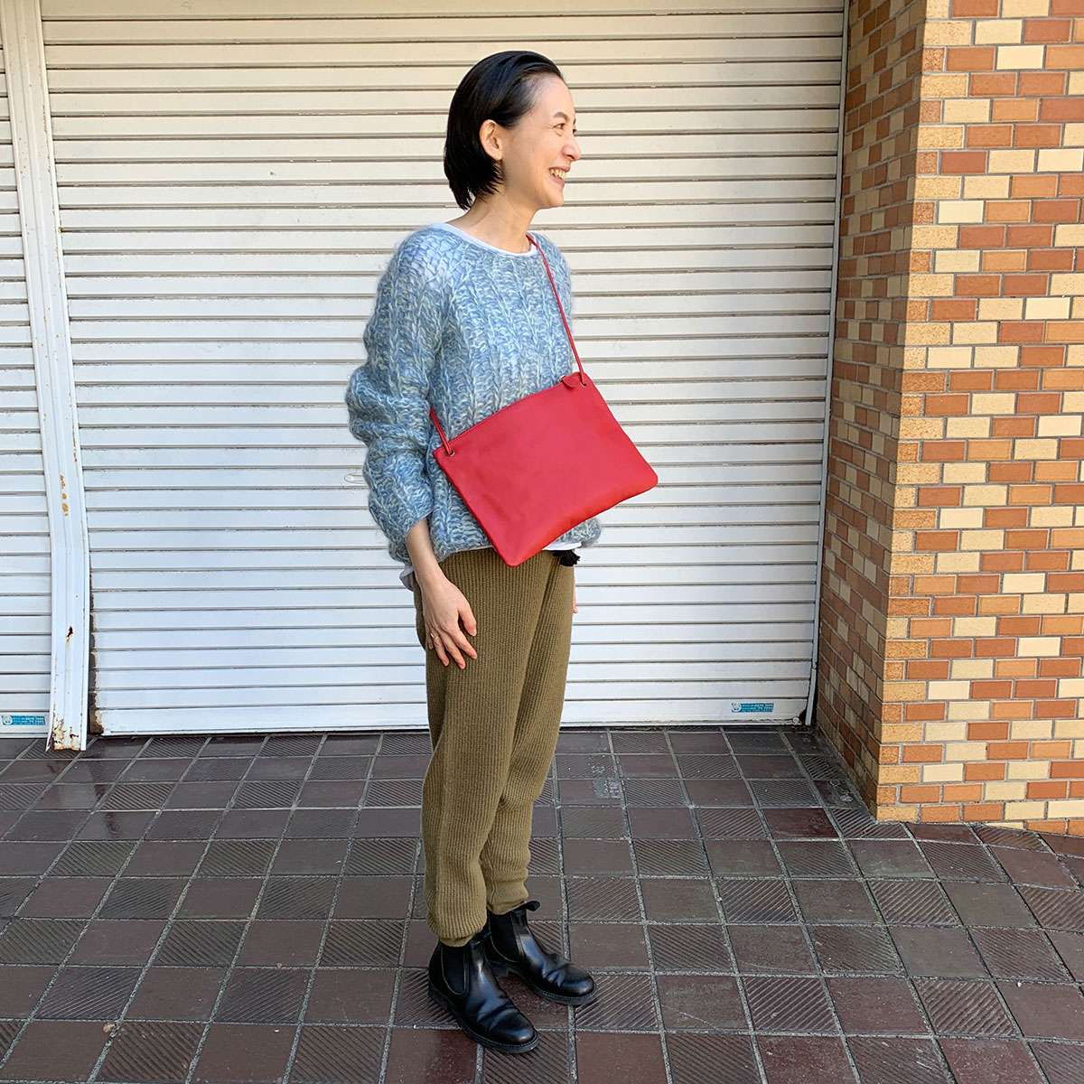 赤いバッグはポイントになりますね。