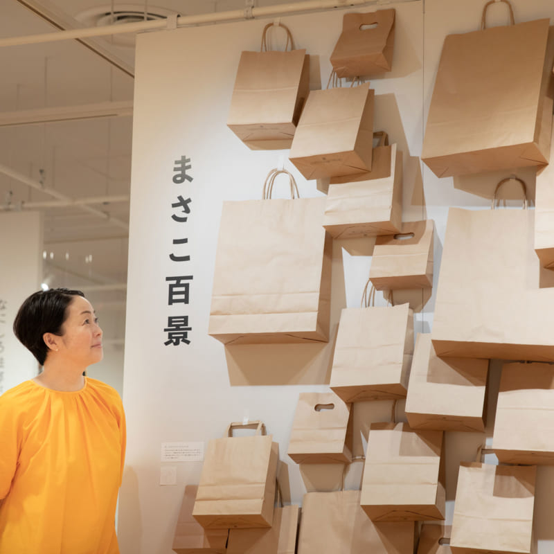 会場入り口の壁面を埋めるクラフトの紙袋!