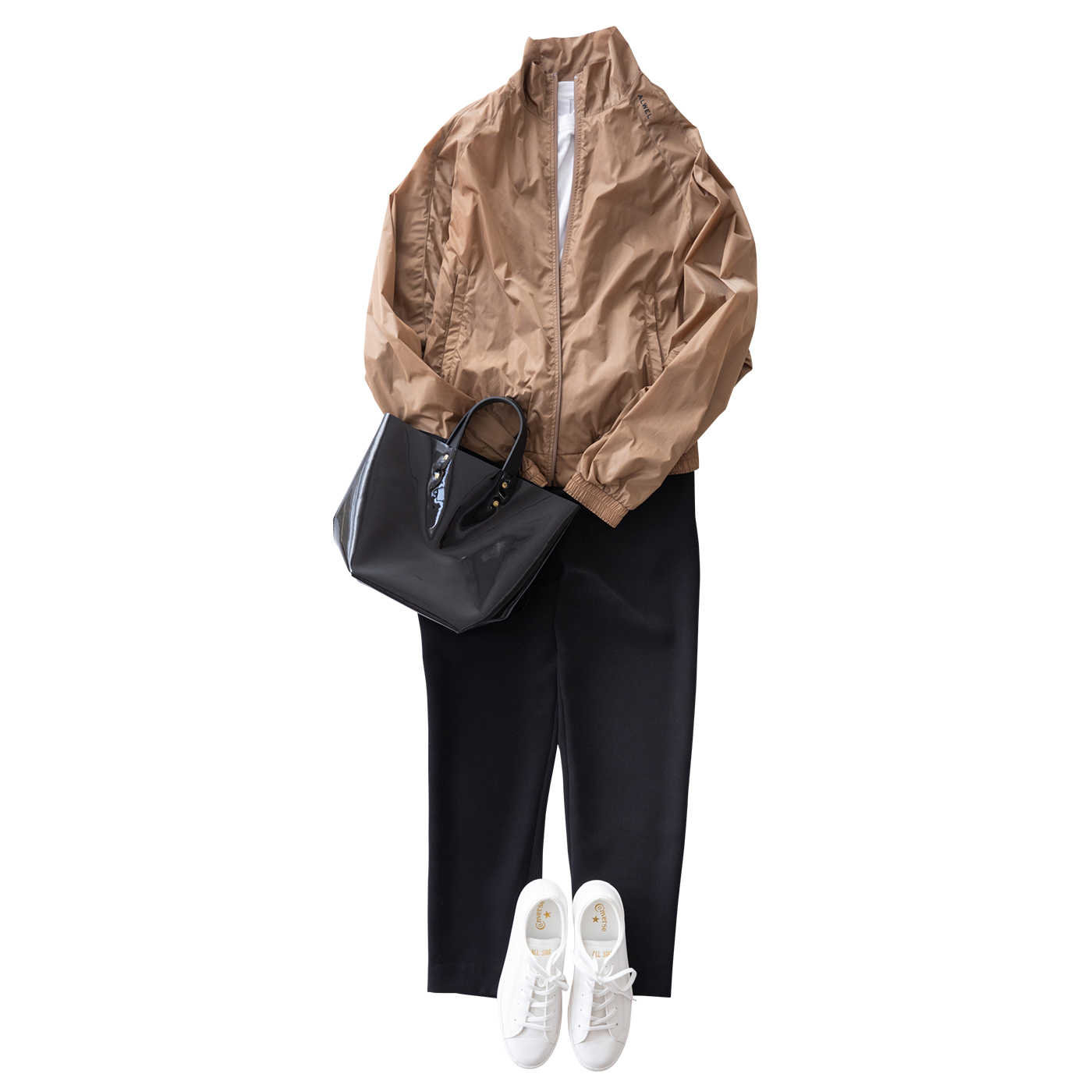 ブラウンのブルゾン、黒いパンツにスニーカー。