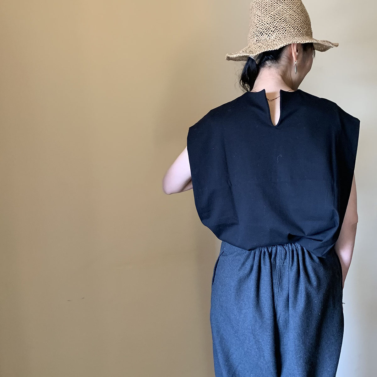 ゆったりとしたシルエットのパンツに合わせて