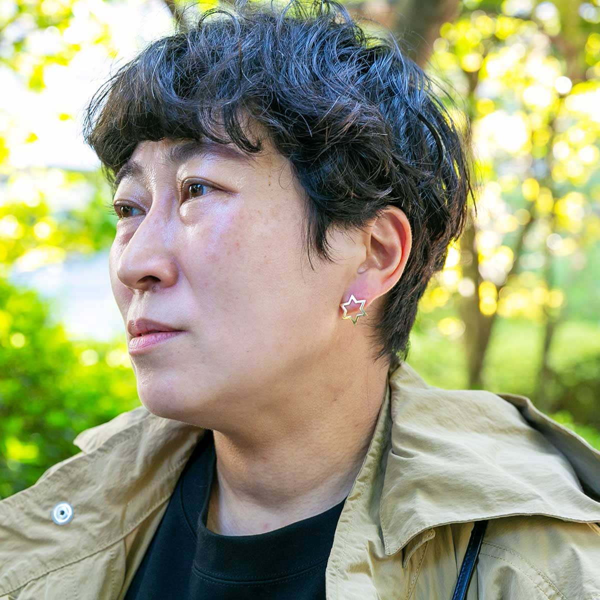 左耳に星形のゴールドのピアス。