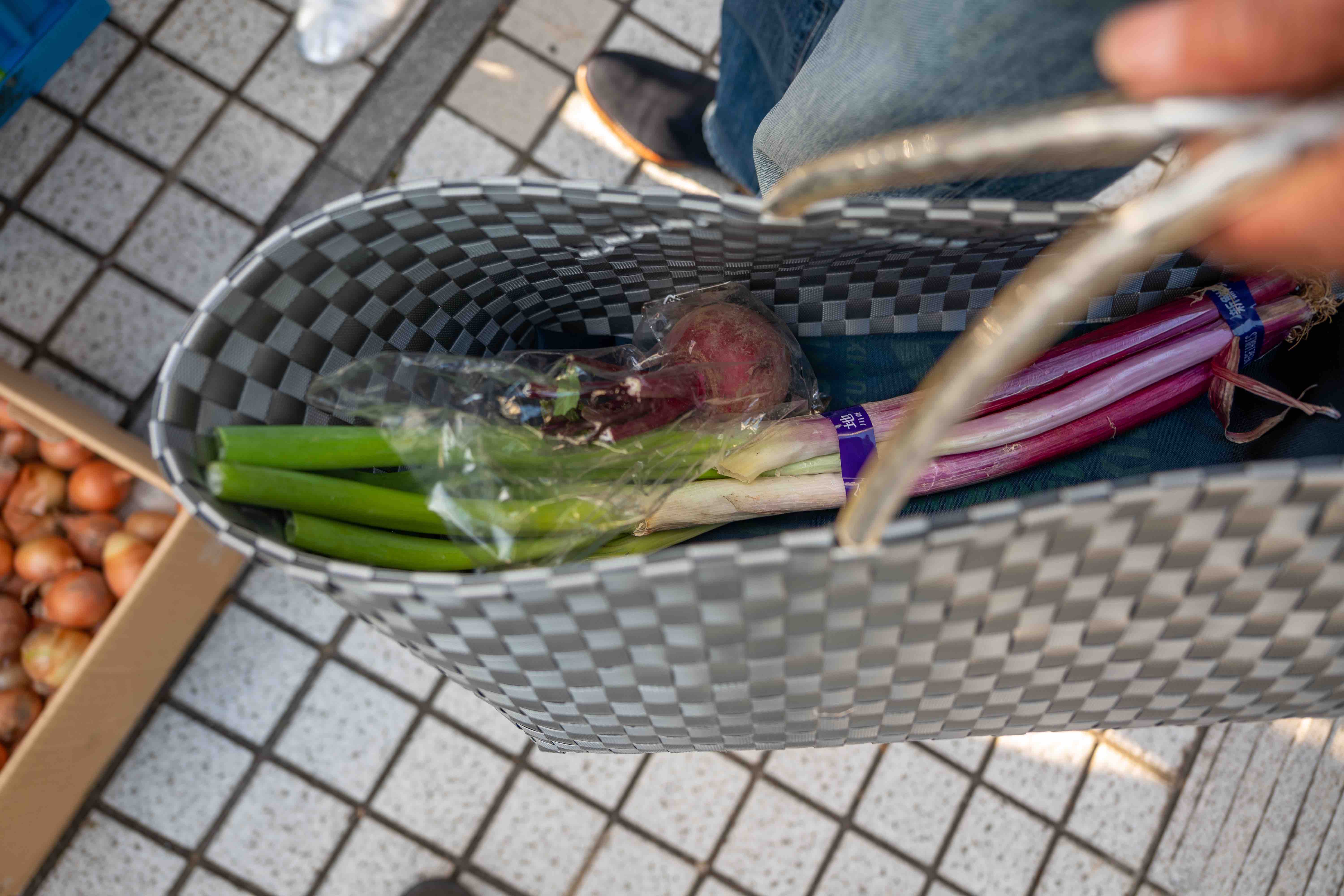 かごを持つ手もたくましい。