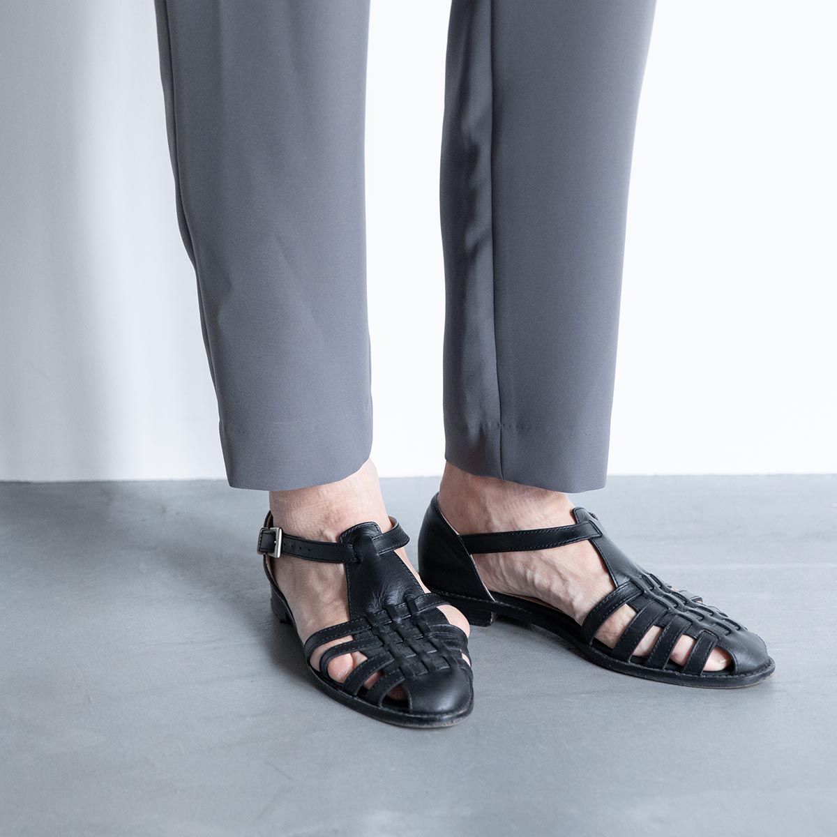 靴やリング、かごバッグの持ち手の黒で引き締めます。