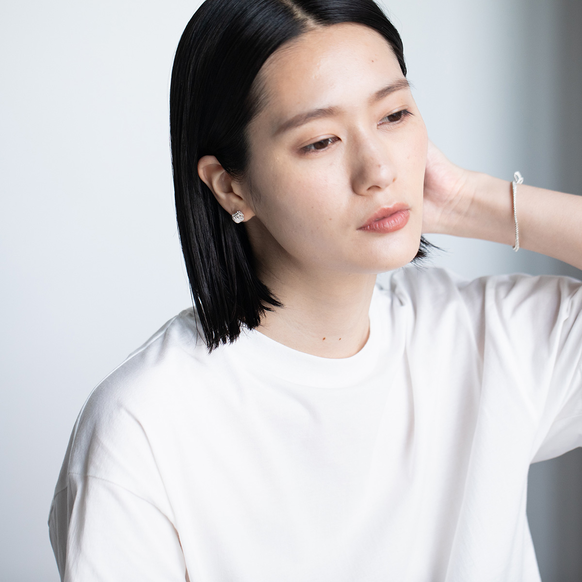 白いTシャツにシルバーのビーズのピアスとブレスレット。