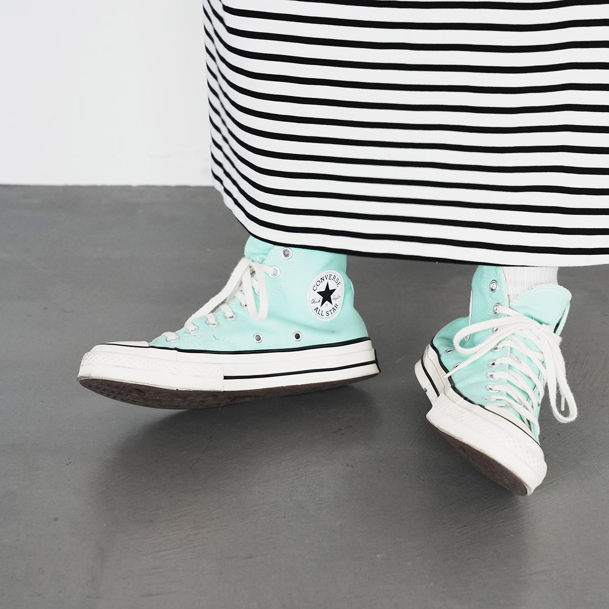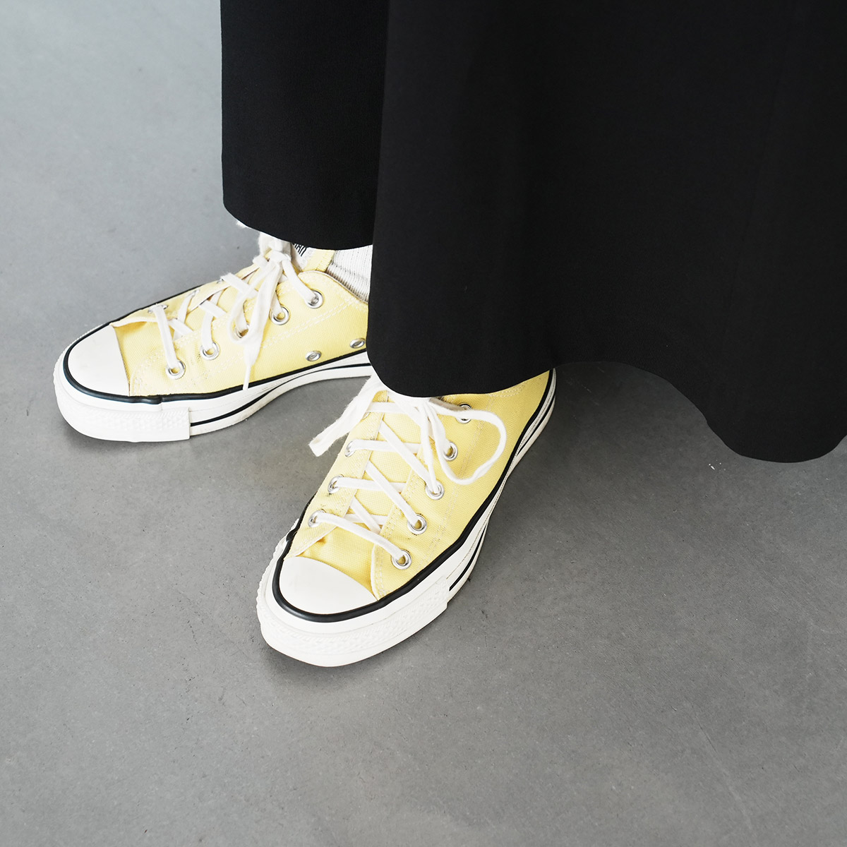 イエローのコンバースに、ギンガムチェックのバッグ。