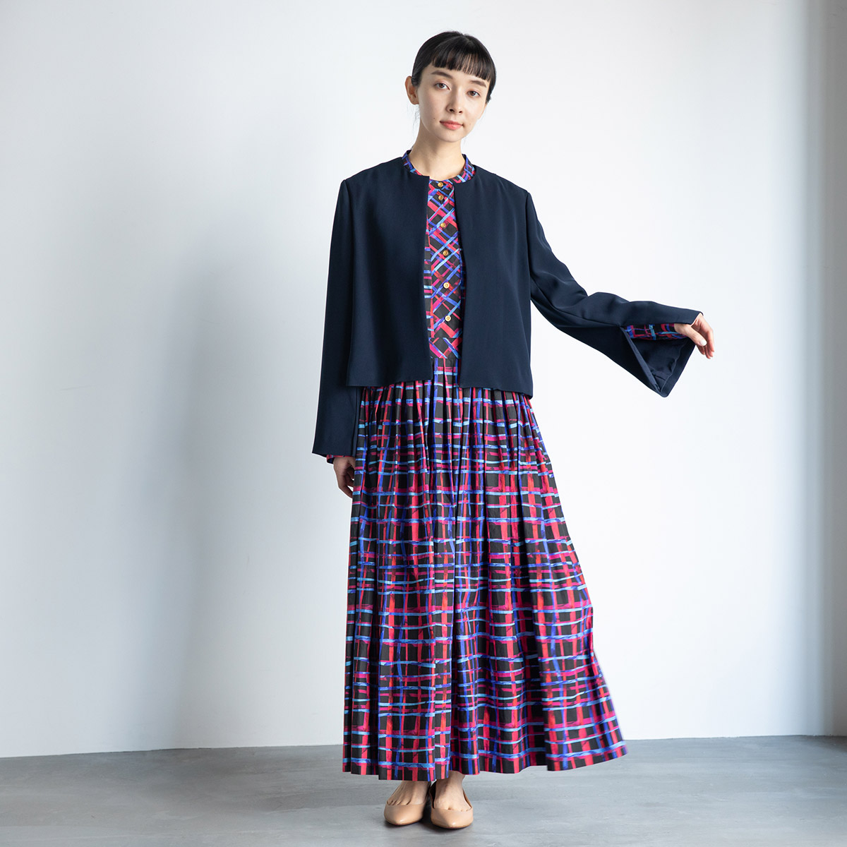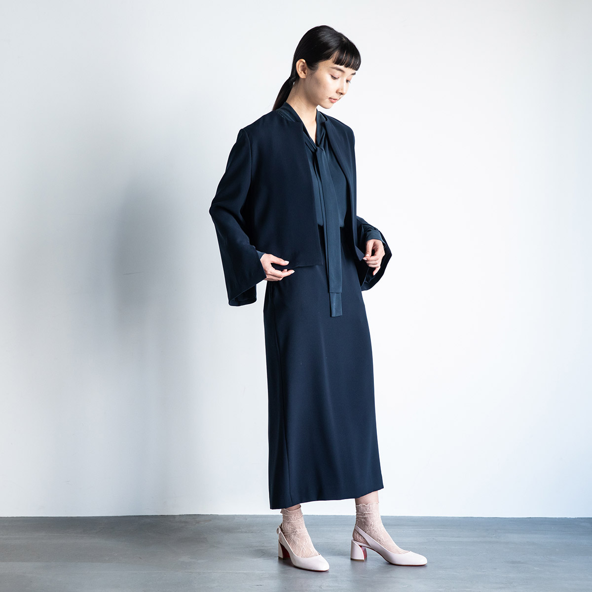 ネイビーのノーカラースリットスリーブジャケットと