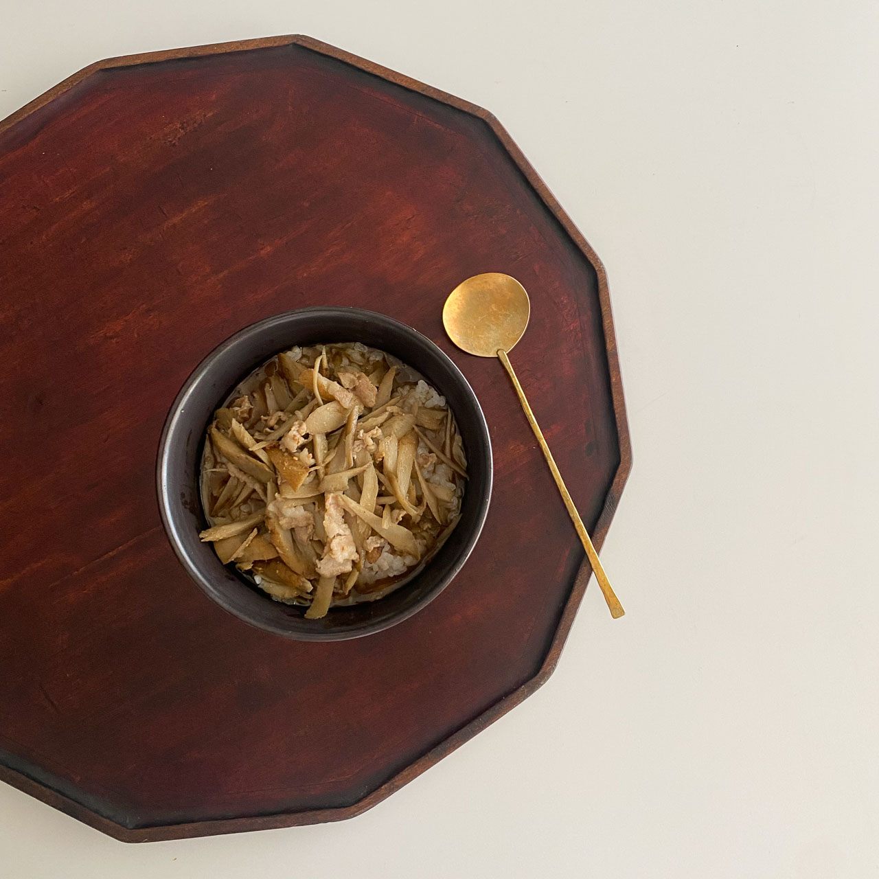 木のお盆と黒い陶器に真鍮が加わると、