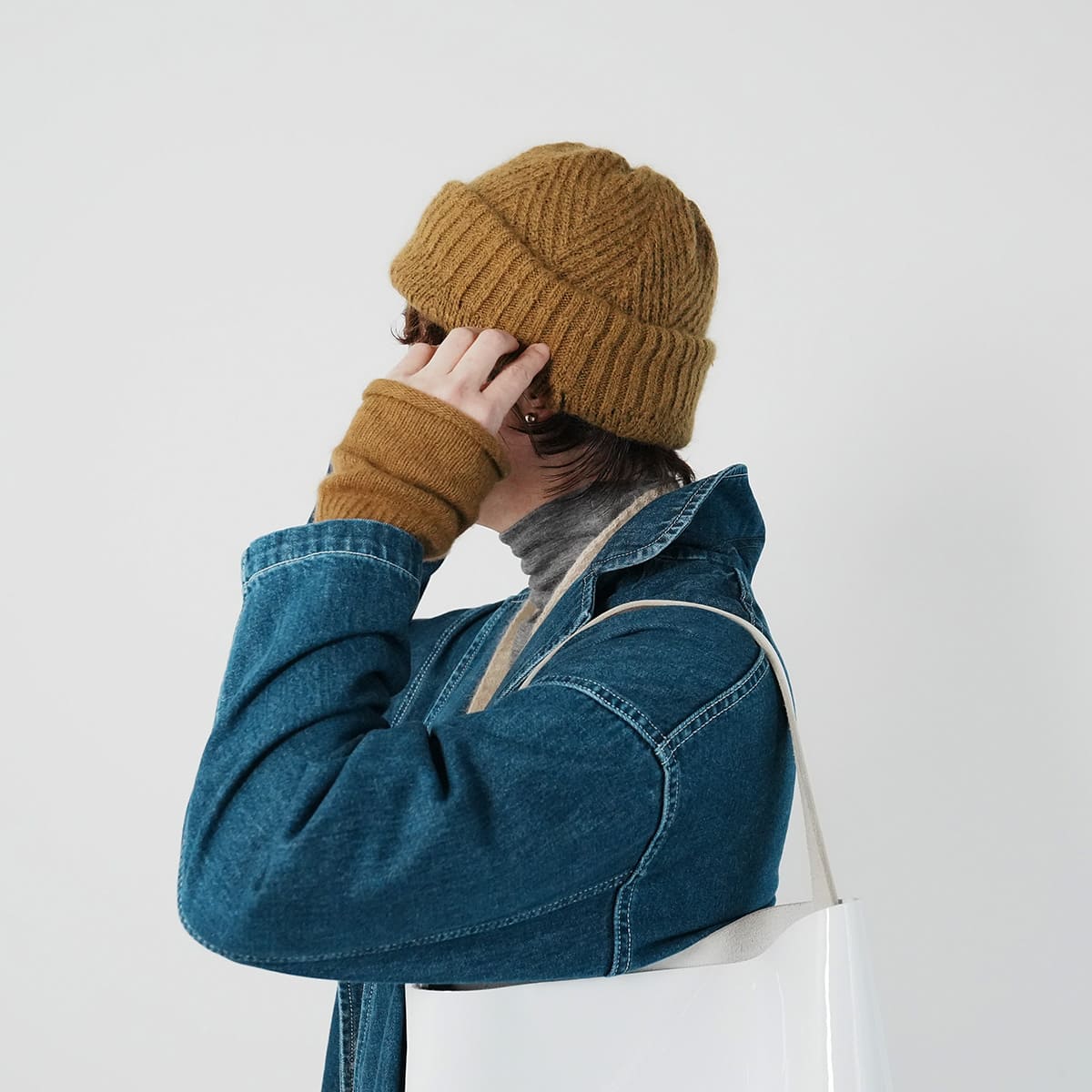 ニット帽と手袋はchisakiのもの。