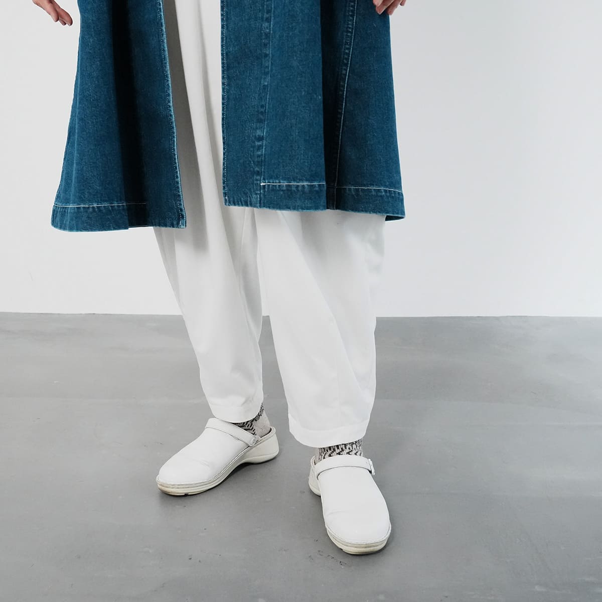 パンツも靴も白でまとめて。